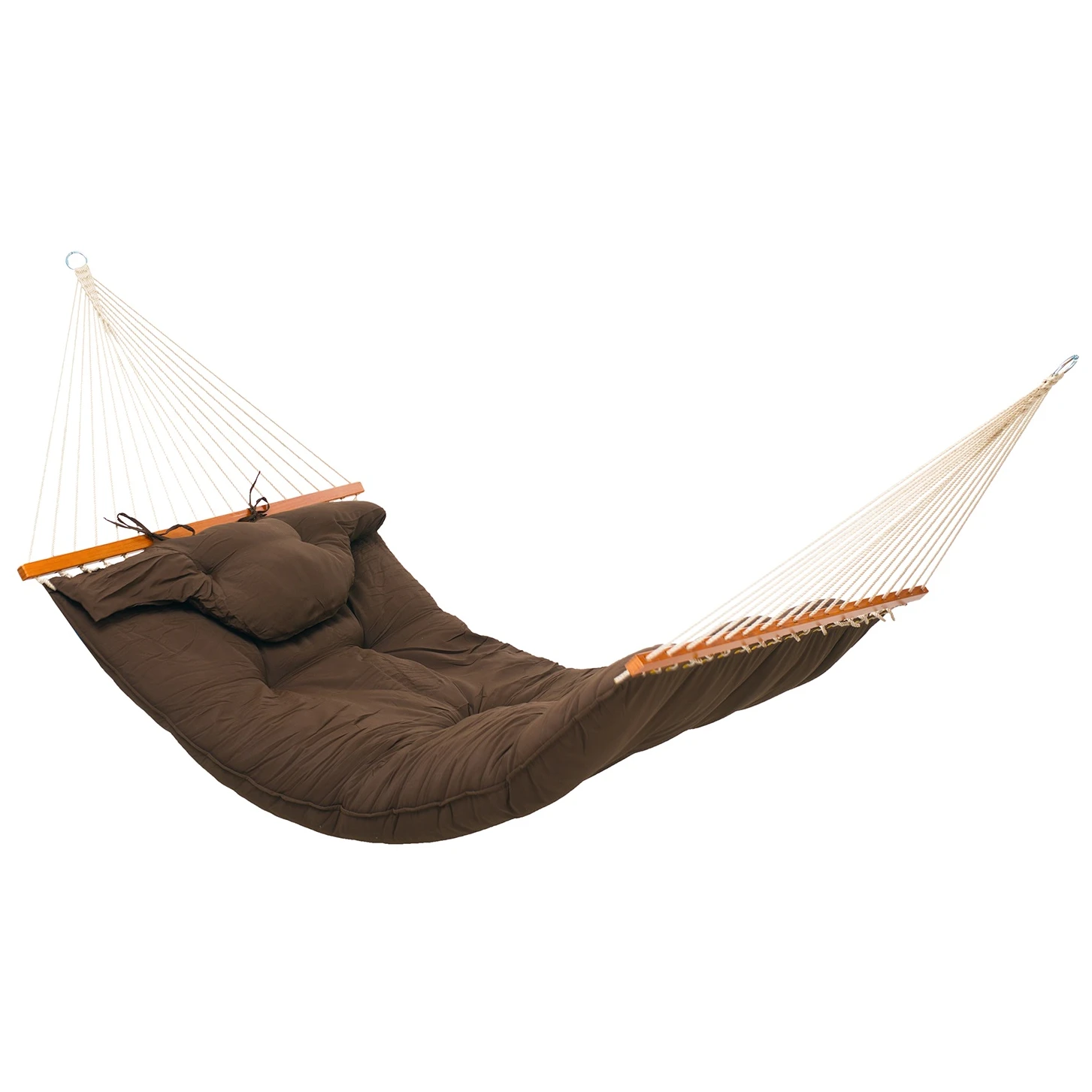Queen vom Spezialhersteller Hamaka.eu ist eine gepolsterte Hängematte, die Ihnen das Gefühl vermittelt, als würden Sie im Bett auf Bettdecken liegen. Das Netz bietet Platz für bis zu zwei Personen und kann insgesamt maximal 180 kg tragen.