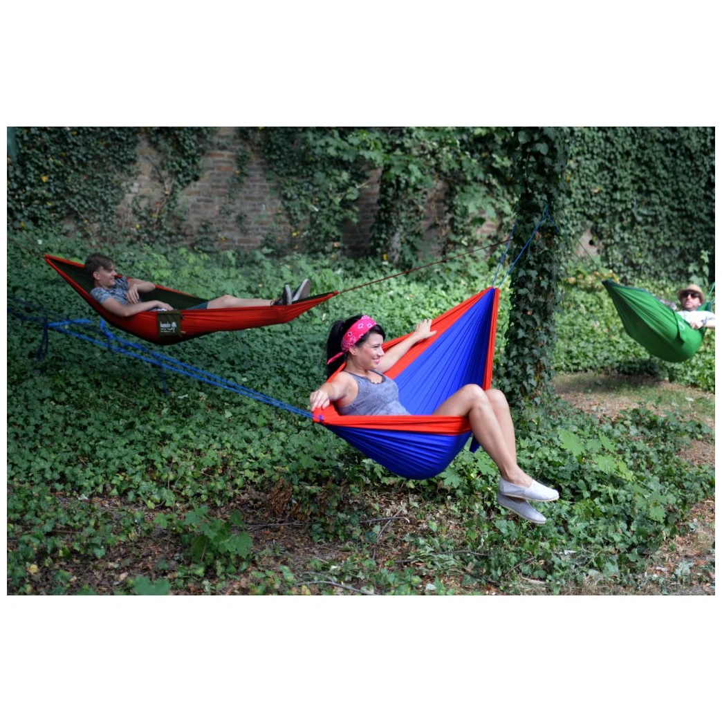 Hängematte für eine Person Die Hamaka Single besteht aus robustem, aber leichtem Polyester , das sich angenehm anfühlt. Im Gegensatz zu Baumwolle kann Polyester die ganze Saison über im Freien bleiben, Regen kann ihm nichts anhaben. Dank der Leichtigkeit und Kompaktheit des Netzes können Sie überall entspannen, egal ob im Garten oder auf Reisen.