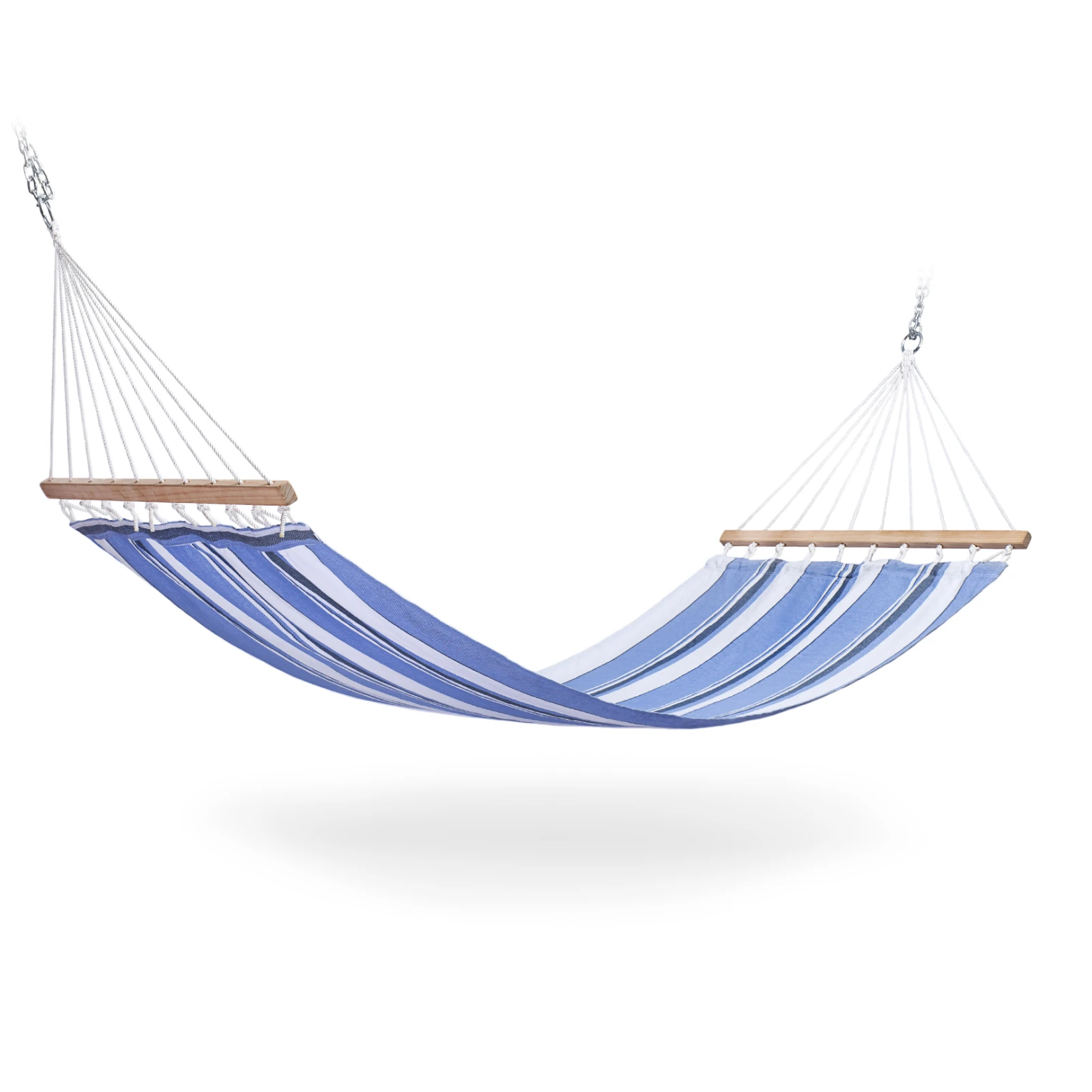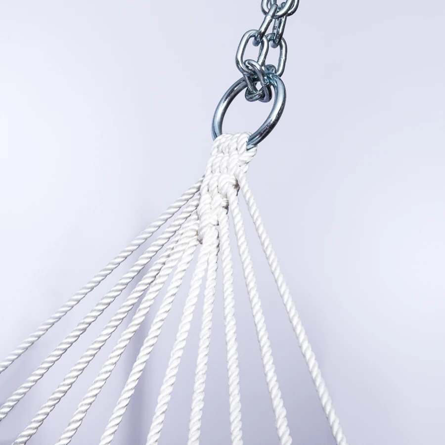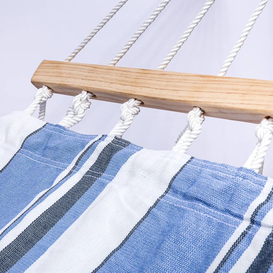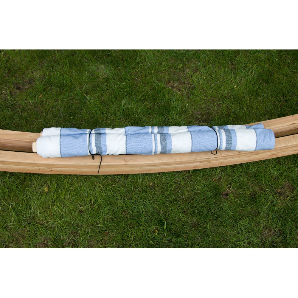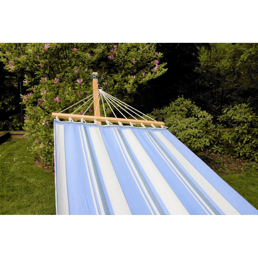Hängematte Die einlagige Hängematte aus Baumwolle fühlt sich angenehm an und bietet Ihnen eine gemütliche Oase beim Ausruhen oder Lesen. Holzstäbe helfen, die Form des Netzes zu halten und sorgen so für bequemeres Aufstehen und Hinlegen.