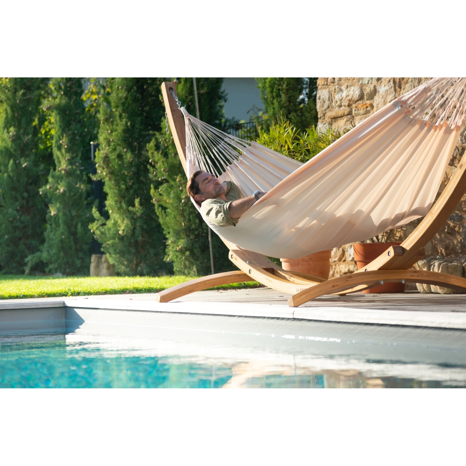 Die Brisa Double vom Hersteller La Siesta ist eine Hängematte, die Sie lieben werden. Es bringt einen Hauch lateinamerikanischer Behaglichkeit und Unbeschwertheit in Ihren Garten. Sie können ihn problemlos den ganzen Sommer im Freien stehen lassen, er hält den Launen der Witterung ebenso stand wie einer intensiven Beanspruchung. Es fühlt sich angenehm an und ist pflegeleicht. Wählen Sie Ihr Modell – elegant oder farbenfroh – und genießen Sie die langen Sommertage im Freien.