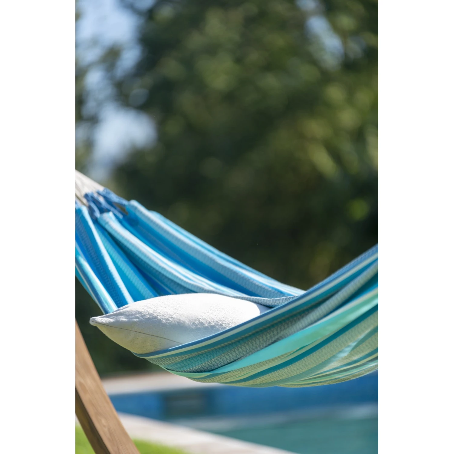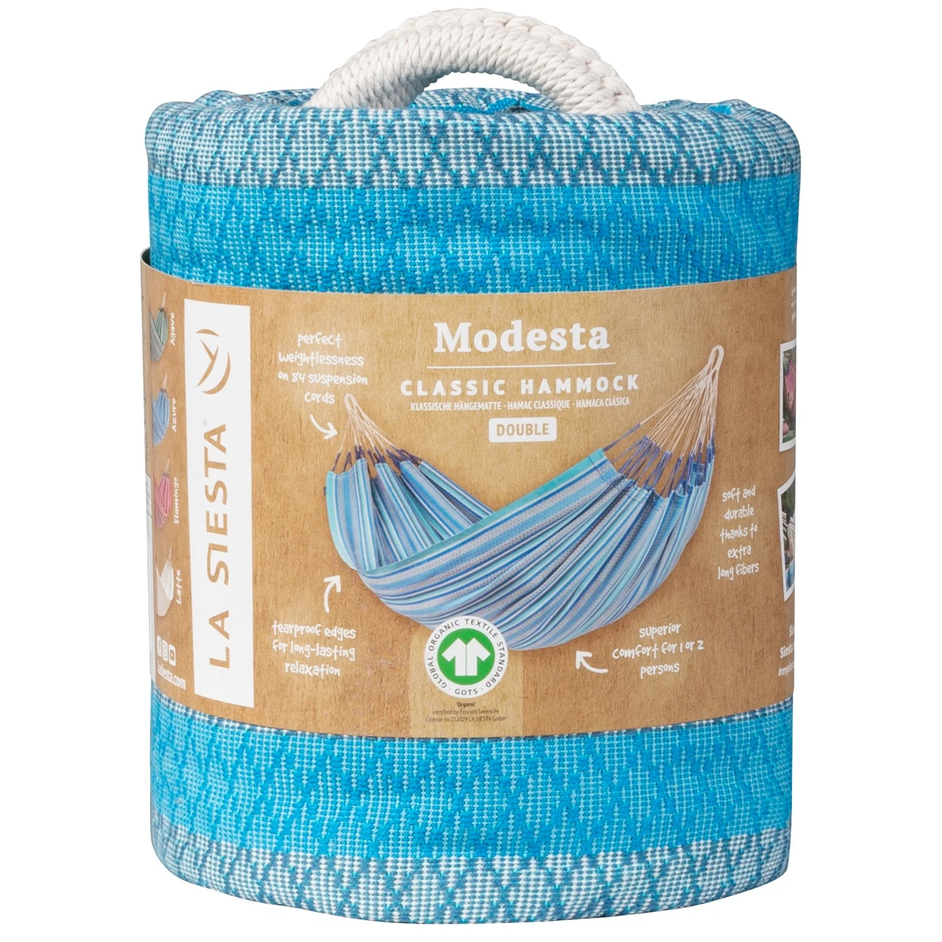 Die Modesta Double Pattern Hängematte der Marke La Siesta hat klare Linien und ein schlichtes Design. Die Hängematte besteht aus mensch- und naturschonend angebauter Bio-Baumwolle und lässt sich allein oder zu zweit wunderbar für eine schöne Auszeit nutzen. Der Stoff fühlt sich weich an, ist sanft zur Haut und pflegeleicht. Modesta zeichnet sich durch eine Vielzahl an herabhängenden Kordeln aus. Diese sorgen für eine gleichmäßige Gewichtsverteilung, höchsten Komfort und eine lange Lebensdauer. Die Haltbarkeit des Netzes wird zusätzlich durch verstärkte Kanten gegen Ausreißenerhöht. Die Hängematte ist in einem Naturton aus ungebleichtem und ungefärbtem Stoff erhältlich.