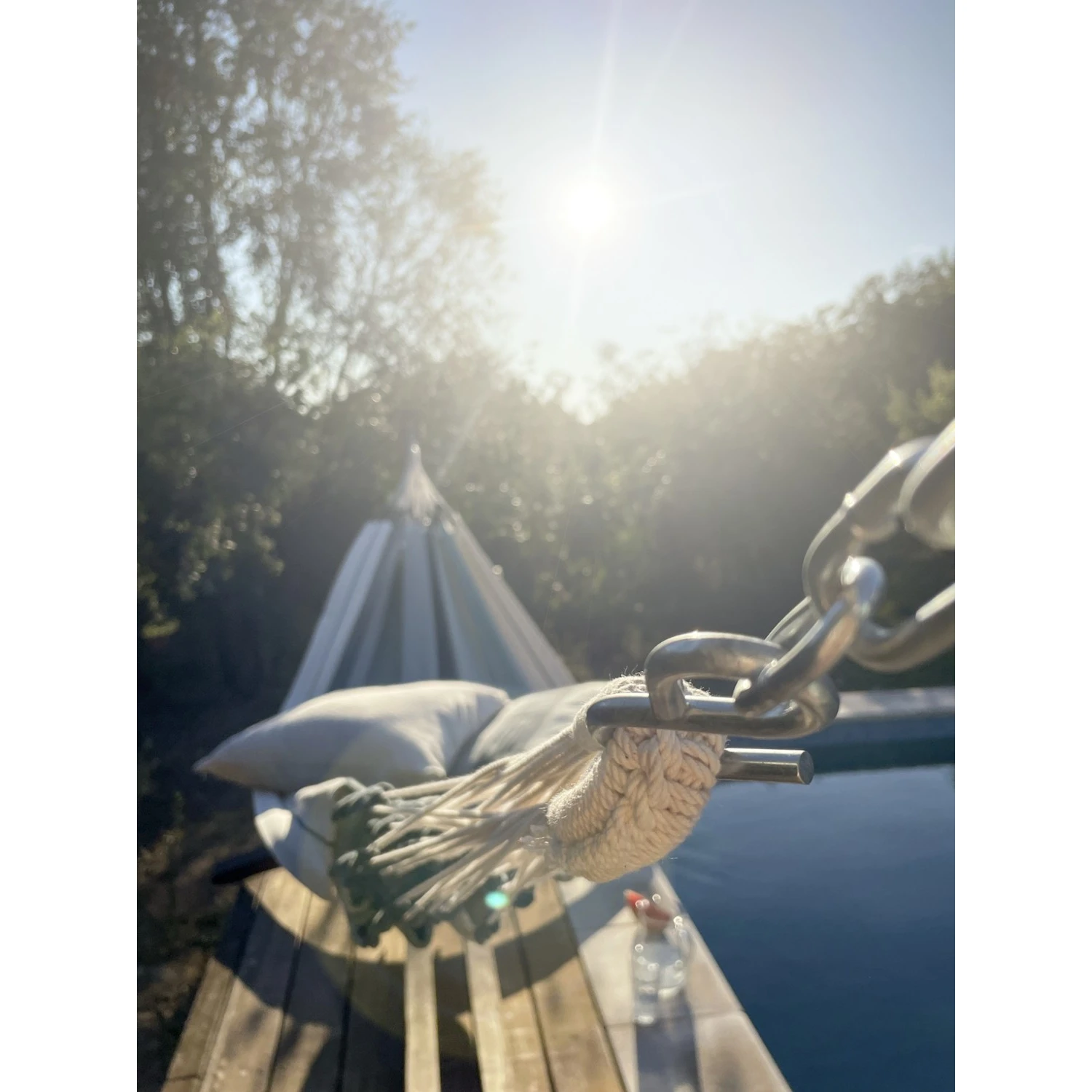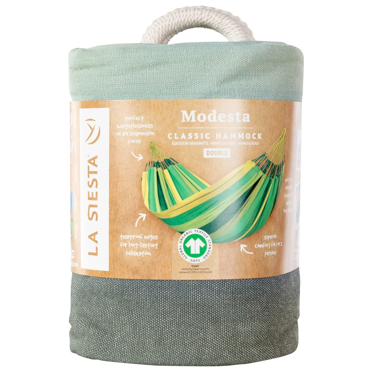 Die Modesta Double Stripes Hängematte der Marke La Siesta verfügt über klare Linien und ein schlichtes Design. Die Hängematte besteht aus mensch- und naturschonend angebauter Bio-Baumwolle und lässt sich allein oder zu zweit wunderbar für eine schöne Auszeit nutzen. Der Stoff fühlt sich weich an, ist sanft zur Haut und pflegeleicht. Modesta zeichnet sich durch eine Vielzahl an herabhängenden Kordeln aus. Diese sorgen für eine gleichmäßige Gewichtsverteilung, höchsten Komfort und eine lange Lebensdauer. Die Haltbarkeit des Netzes wird zusätzlich durch verstärkte Kanten gegen Ausreißenerhöht. Die Hängematte ist in einem Naturton aus ungebleichtem und ungefärbtem Stoff erhältlich.