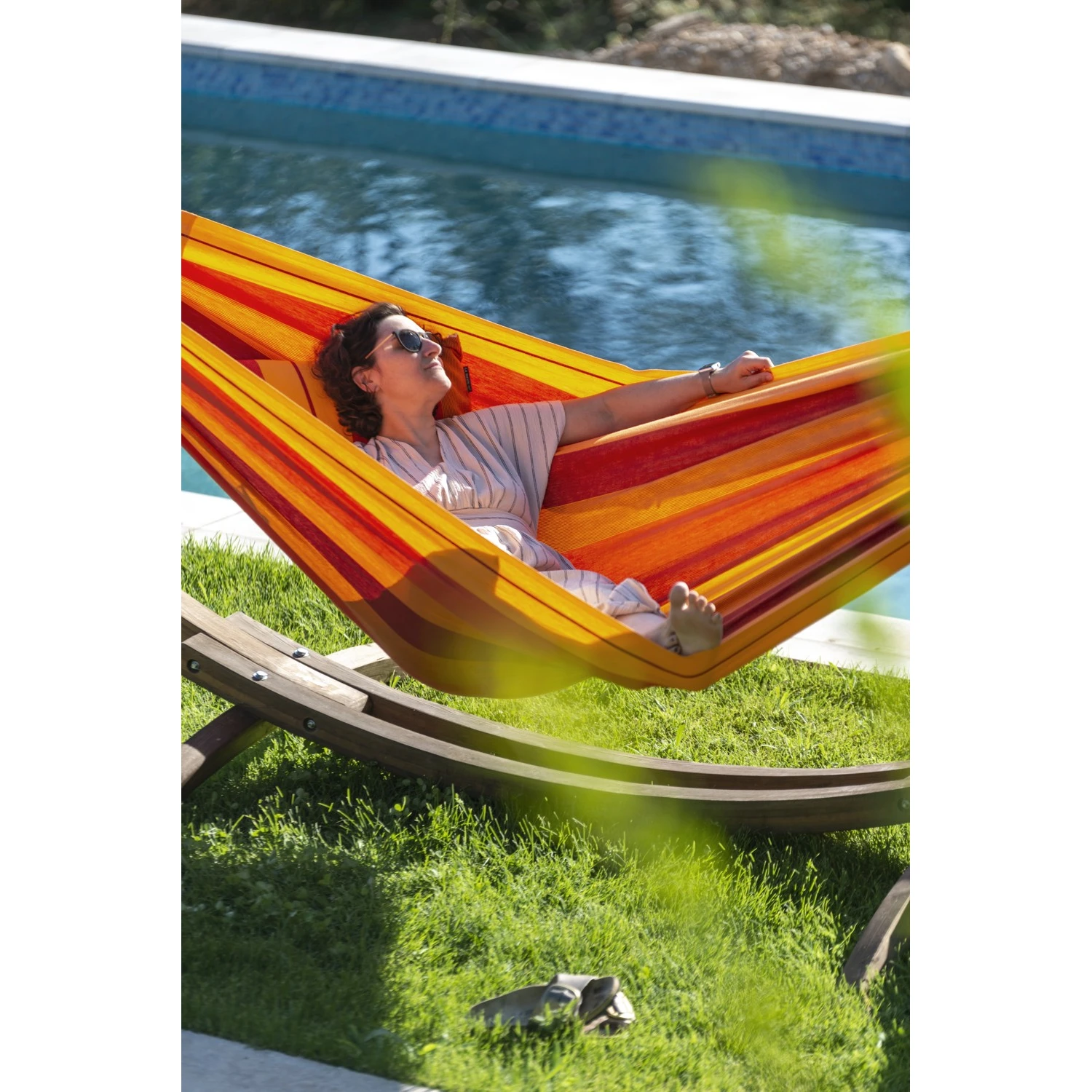 Für die Herstellung verwendet La Siesta ausschließlich ökologische Rohstoffe und Holz aus verantwortungsvoller Forstwirtschaft. Am Angebot des Unternehmens findet man auch Reisehängematten oder Kinderhängematten.