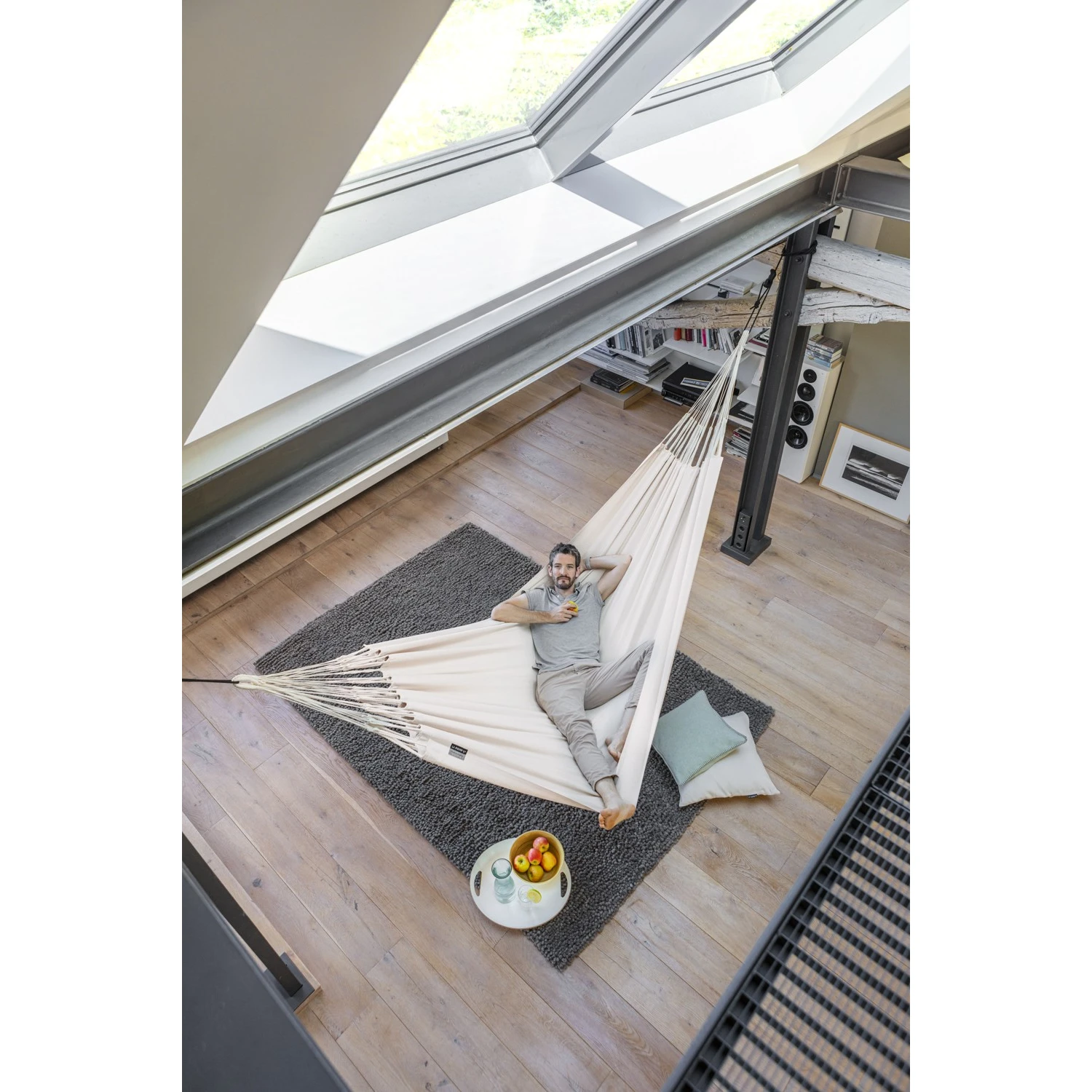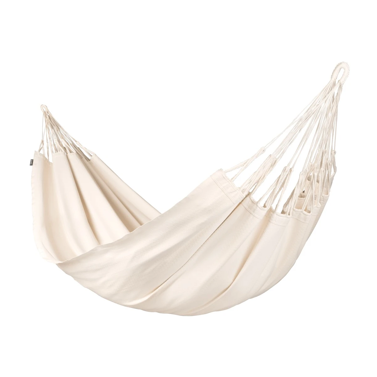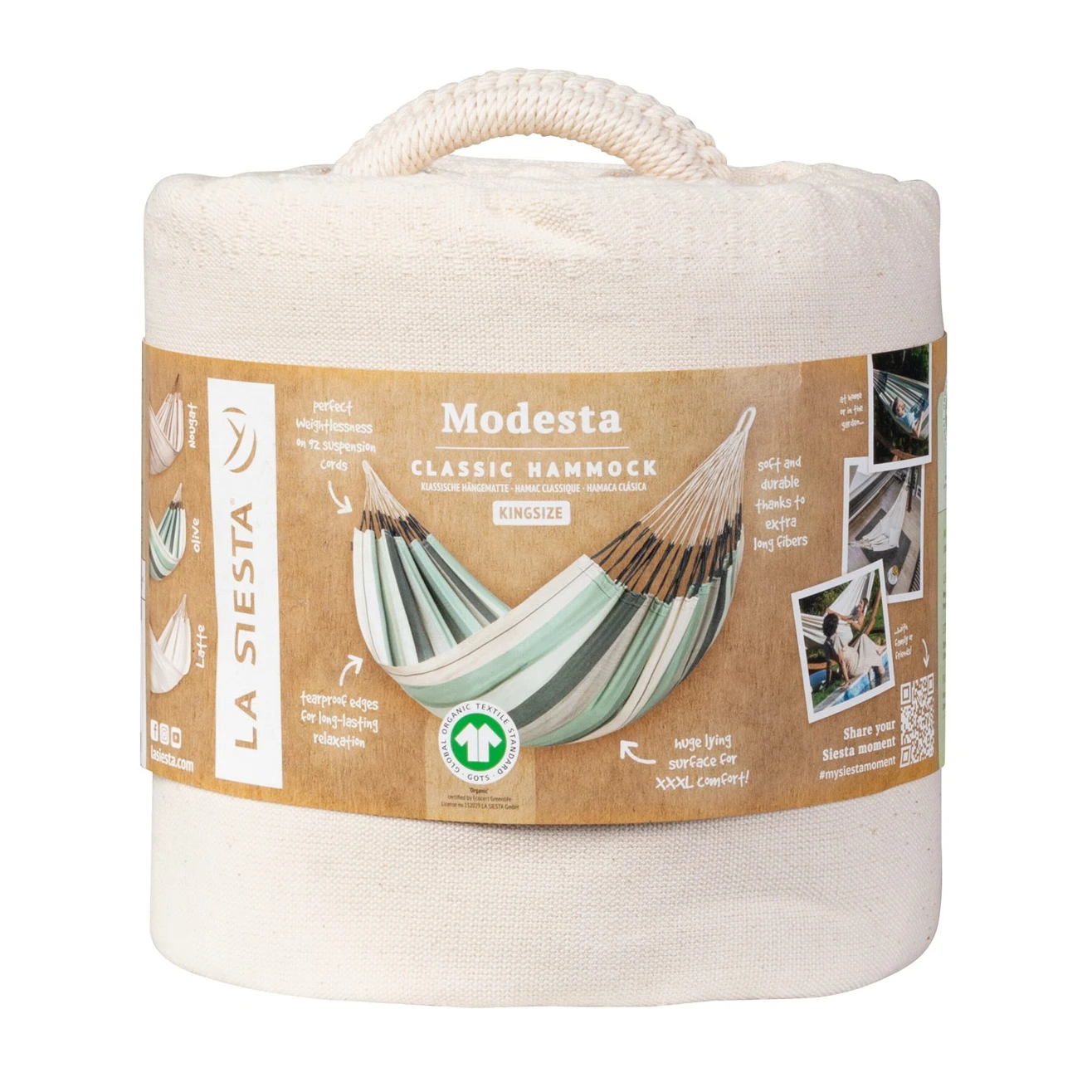 Die Modesta Kingsize Mono Hängematte der Marke La Siesta verfügt über klare Linien und ein schlichtes Design. Die Hängematte besteht aus Bio-Baumwolle , die unter Schonung von Mensch und Natur angebaut wird, und Sie können darin eine schöne Auszeit mit Ihrem Partner und Ihren Kindern genießen. Der Stoff fühlt sich weich an, ist sanft zur Haut und pflegeleicht. Modesta zeichnet sich durch eine Vielzahl an herabhängenden Kordeln aus. Diese sorgen für eine gleichmäßige Gewichtsverteilung, höchsten Komfort und eine lange Lebensdauer. Die Haltbarkeit des Netzes wird zusätzlich durch verstärkte Kanten gegen Ausreißenerhöht. Die Hängematte ist in einem Naturton aus ungebleichtem und ungefärbtem Stoff erhältlich.