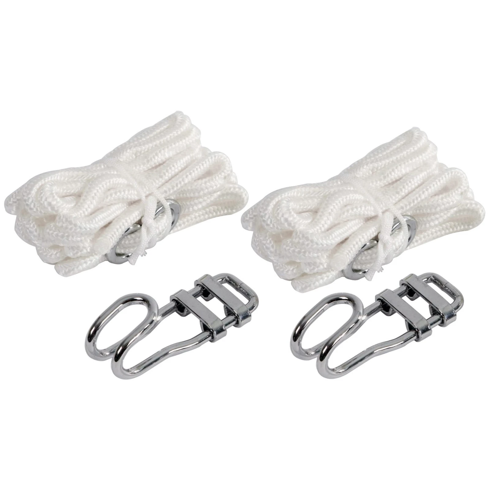 Komplettes Set zur Befestigung einer Hängematte Befestigungsset Universal der Firma Bo-Camp. Das Set besteht aus zwei Stahlhaken mit zwei je 3,8 Meter langen Seilen. Zur Befestigung ohne Schrauben oder Nägel.