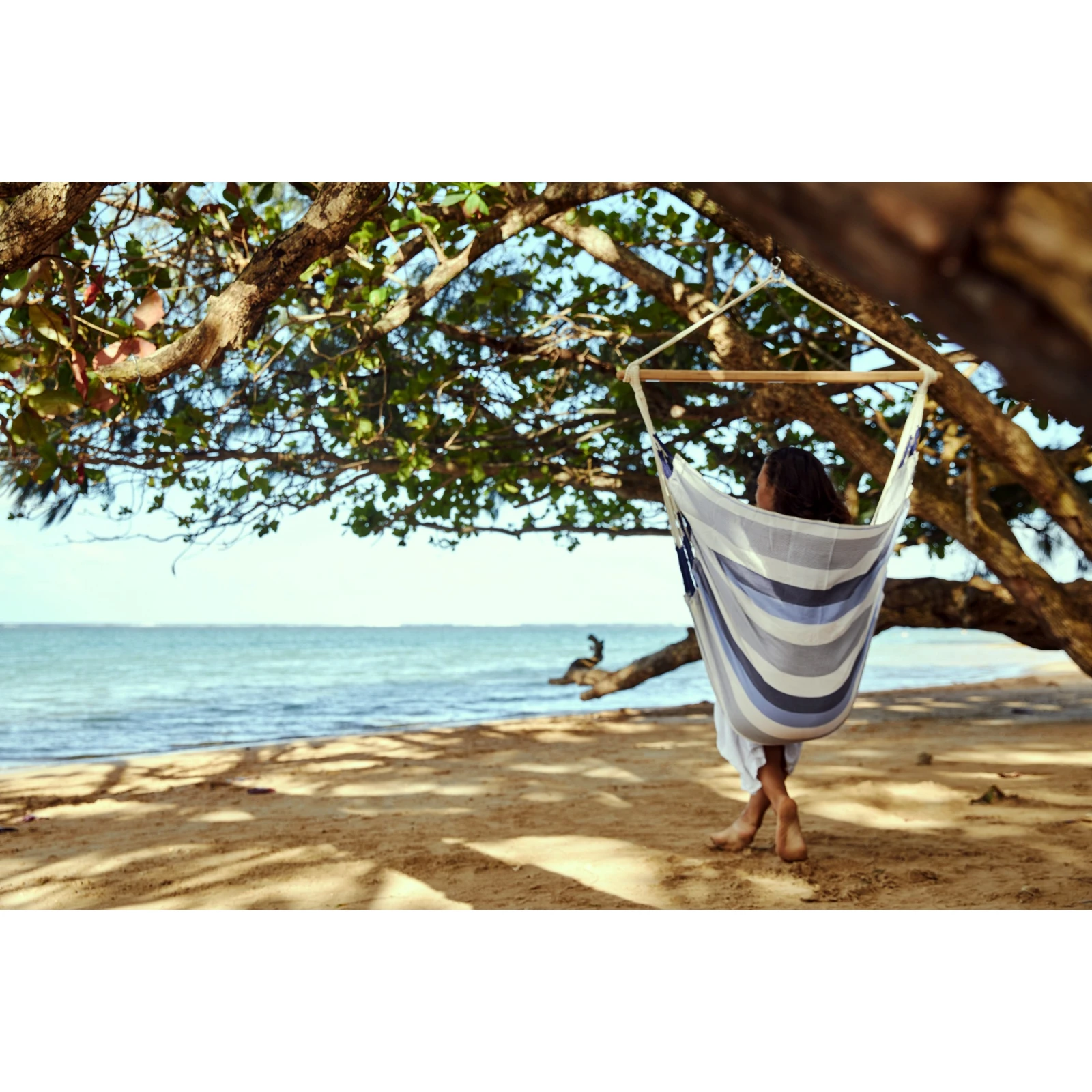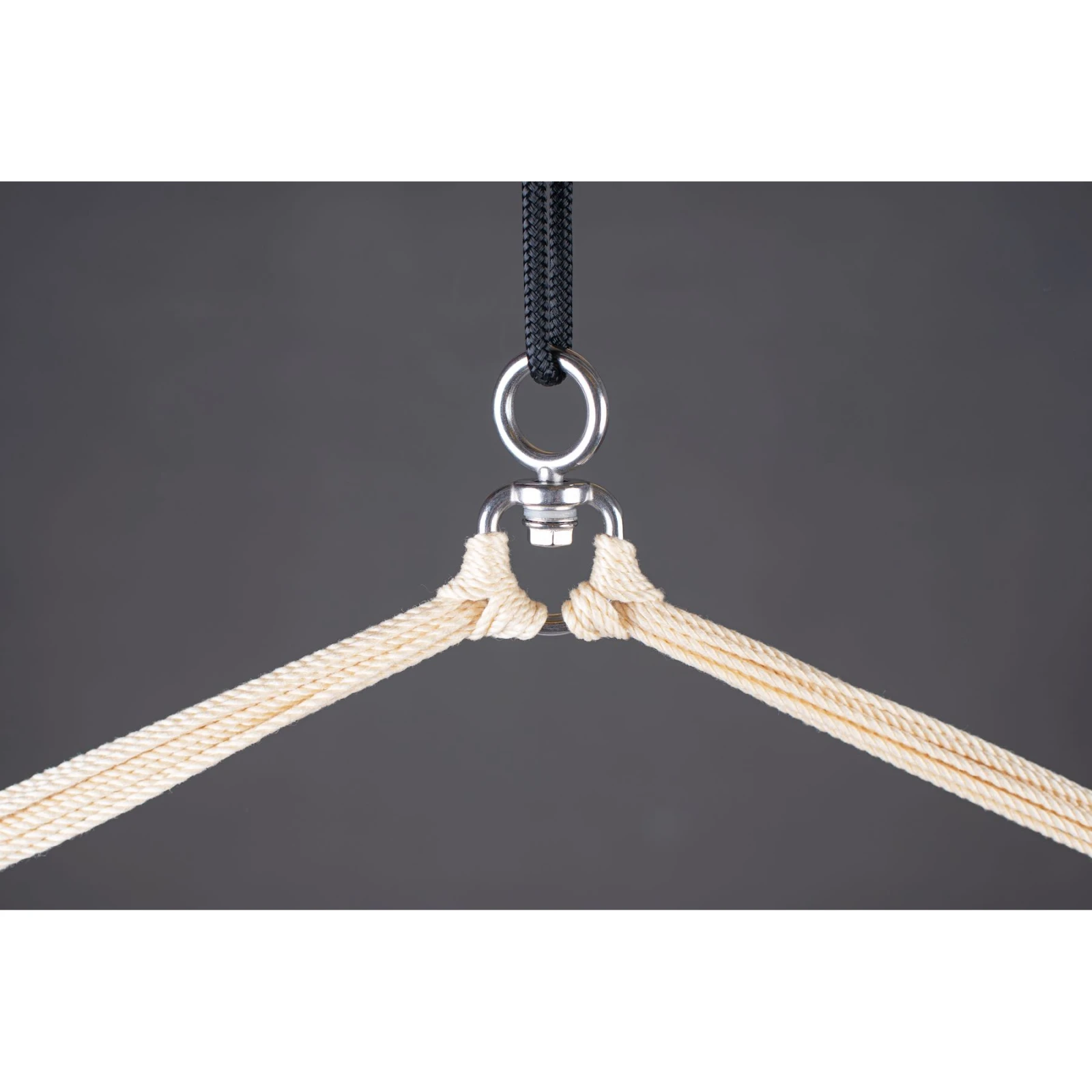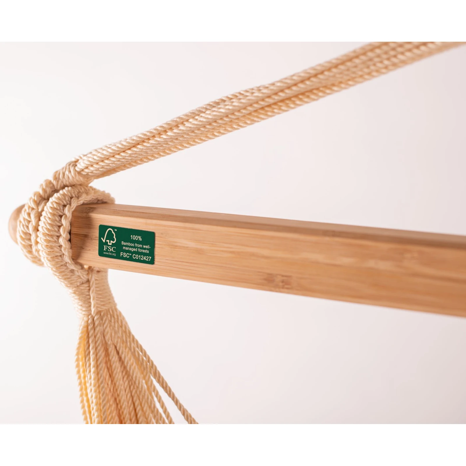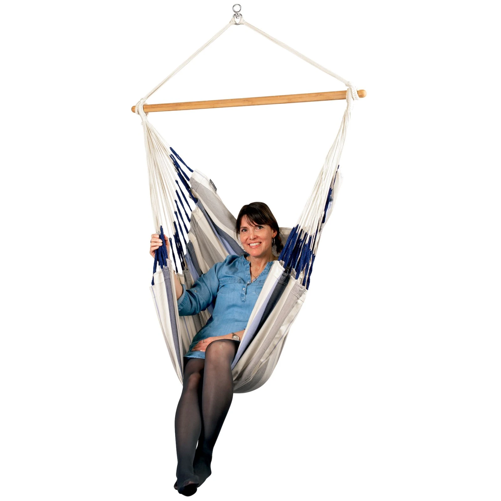 Der Sitz verfügt zusätzlich über einen Spreizstab aus hochwertigem Bambusholz aus nachhaltiger FSC®Bewirtschaftung. Zudem verfügt das Holz dank spezieller Verarbeitungstechnik über eine angenehm glatte Oberfläche und eine hohe Widerstandsfähigkeit gegenüber Witterungseinflüssen. Der integrierte Wirbel mit 360°-Drehung sorgt für eine bequeme und sichere Drehung um die eigene Achse, ohne dass sich die Aufhängeschnüre kreuzen. Die Gesamtbelastbarkeit beträgt bis zu 130 kg.