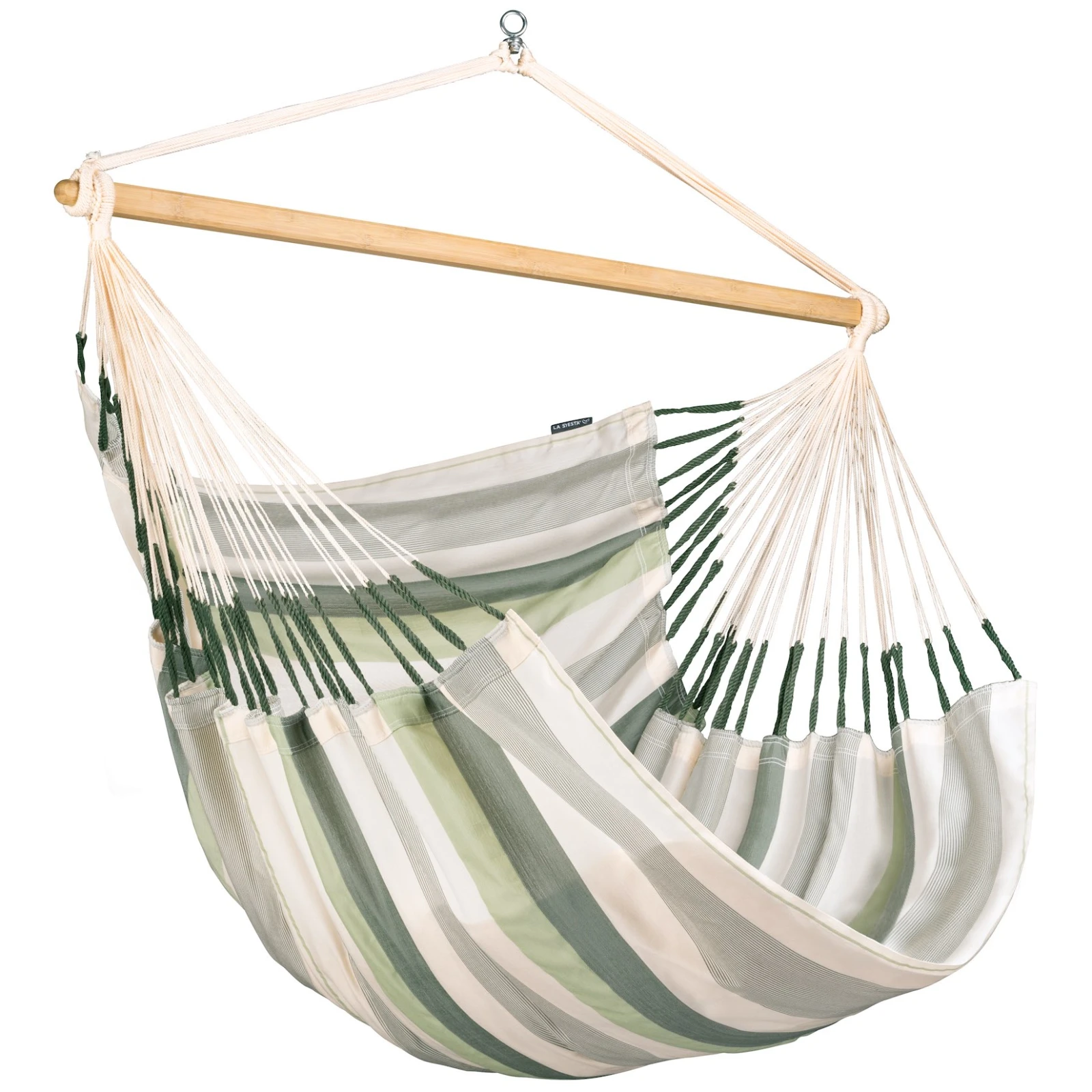 Der geräumige Hängesessel mit Spreizstab Domingo Kingsize von La Siesta ist ideal zum Sitzen und Liegen. Damit ist er der perfekte Begleiter für Entspannung und maximalen Komfort. Für den Ruhekomfort sorgt der hochwertige Funktionsstoff aus 100 % Polypropylen, der speziell für Hängematten und Sitzgelegenheiten entwickelt wurde. Dadurch ist angenehm im Griff, schnelltrocknend, pflegeleicht und wasserfest. Auch die Reißfestigkeit durch die doppelte Anzahl an Schussfäden werden Sie zu schätzen wissen.