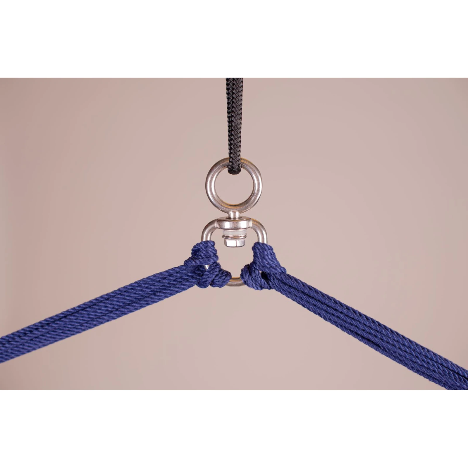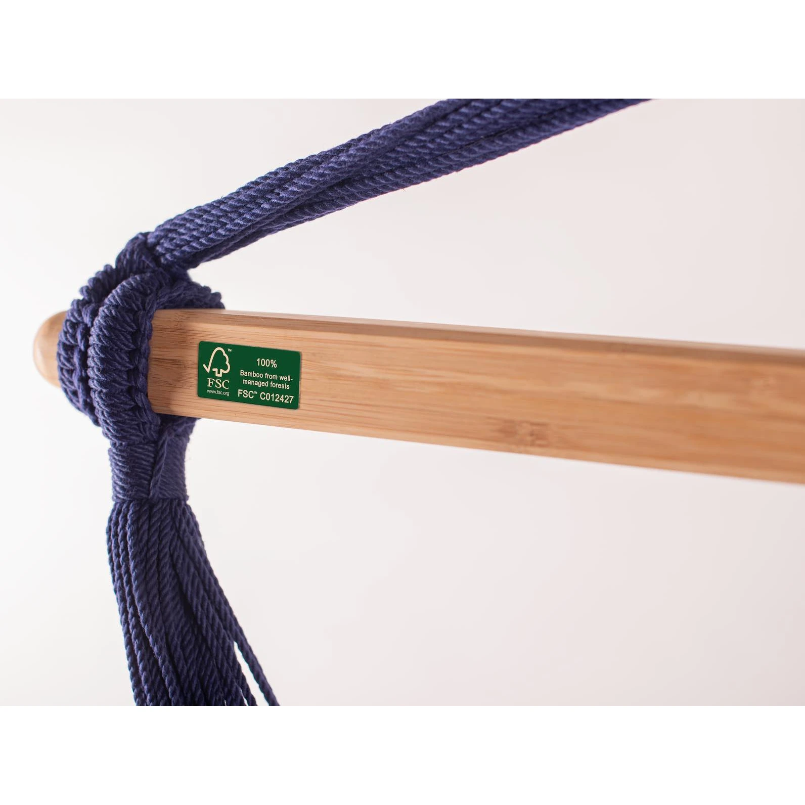 Der Sitz verfügt zusätzlich über einen Spreizstab aus hochwertigem Bambusholz aus nachhaltiger FSC®Bewirtschaftung. Zudem verfügt das Holz dank spezieller Verarbeitungstechnik über eine angenehm glatte Oberfläche und eine hohe Widerstandsfähigkeit gegenüber Witterungseinflüssen. Der integrierte Wirbel mit 360°-Drehung sorgt für eine bequeme und sichere Drehung um die eigene Achse, ohne dass sich die Aufhängeschnüre kreuzen. Die Gesamtbelastbarkeit beträgt bis zu 160 kg.