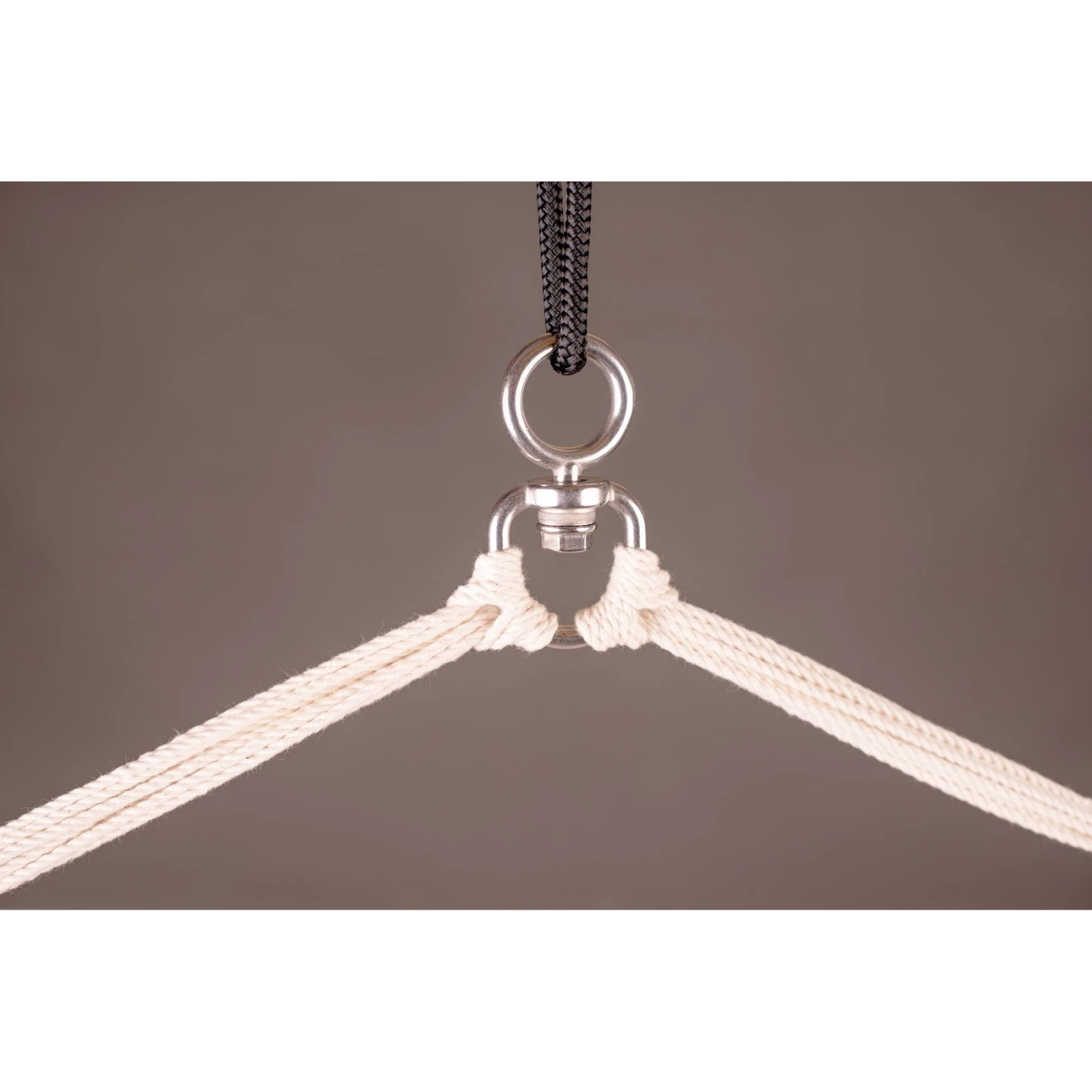 Der Sitz verfügt zusätzlich über einen Spreizstab aus hochwertigem Bambusholz aus nachhaltiger FSC®Bewirtschaftung. Zudem verfügt das Holz dank spezieller Verarbeitungstechnik über eine angenehm glatte Oberfläche und eine hohe Widerstandsfähigkeit gegenüber Witterungseinflüssen. Der integrierte Wirbel mit 360°-Drehung sorgt für eine bequeme und sichere Drehung um die eigene Achse, ohne dass sich die Aufhängeschnüre kreuzen. Die Gesamtbelastbarkeit beträgt bis zu 130 kg.