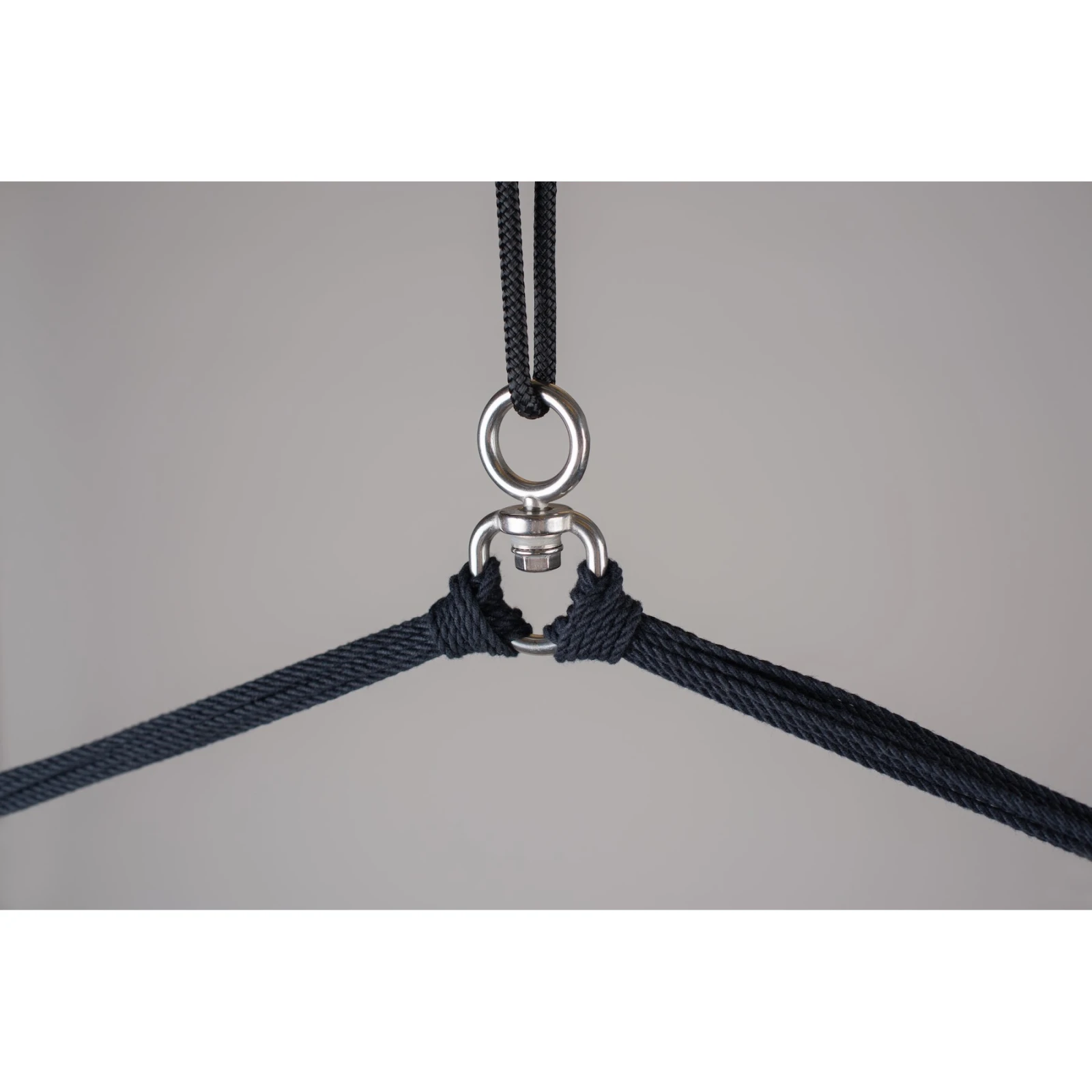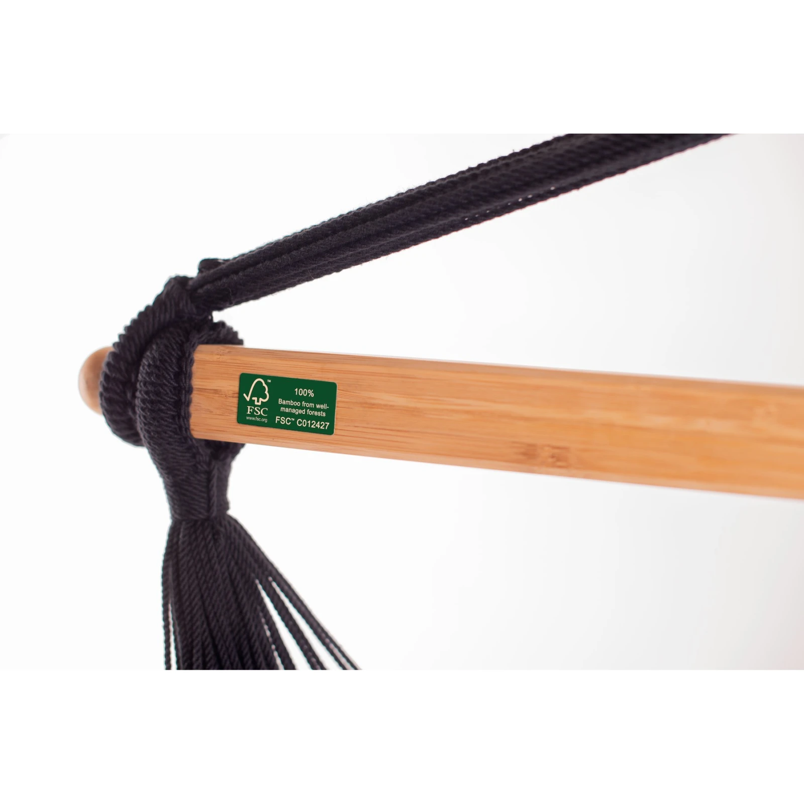 Der Sitz verfügt zusätzlich über einen Spreizstab aus hochwertigem Bambusholz aus nachhaltiger FSC®Bewirtschaftung. Zudem verfügt das Holz dank spezieller Verarbeitungstechnik über eine angenehm glatte Oberfläche und eine hohe Widerstandsfähigkeit gegenüber Witterungseinflüssen. Der integrierte Wirbel mit 360°-Drehung sorgt für eine bequeme und sichere Drehung um die eigene Achse, ohne dass sich die Aufhängeschnüre kreuzen. Die Gesamtbelastbarkeit beträgt bis zu 160 kg.