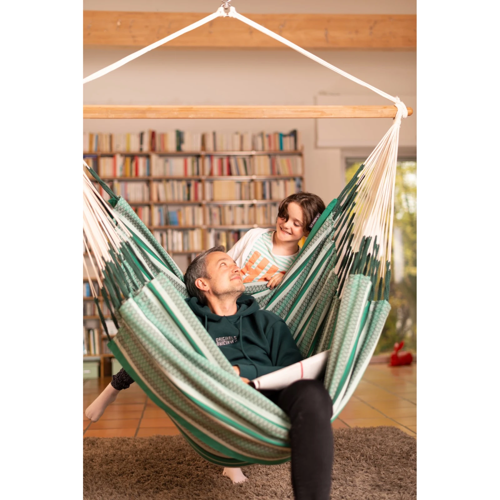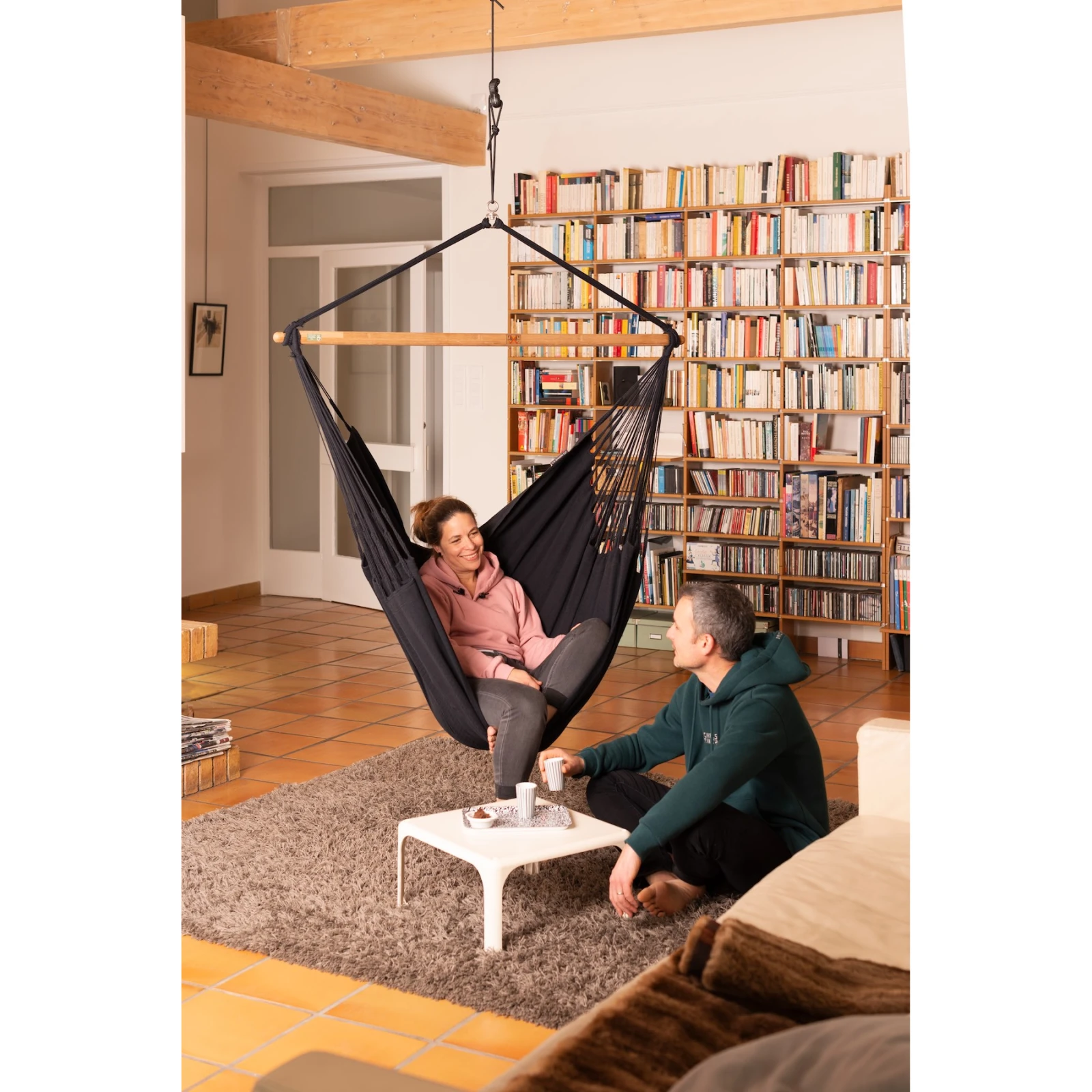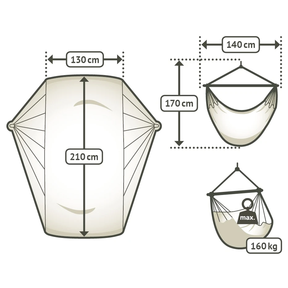 Seine großzügigen Maße (210 cm Länge) laden zum entspannten Sitzen oder Liegen ein und sein Komfort ist mit dem einer Hängematte vergleichbar. Wenn Sie einen kompakteren Hängesessel suchen, empfehlen wir Habana Comfort.