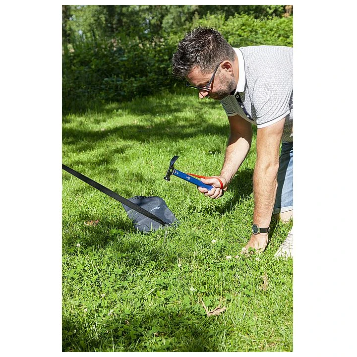 Ein Hammer der niederländischen Firma Bo-Camp zum Einschlagen von Zeltheringen. Dank Stahlkopf und Aluminiumstiel können Sie die Heringe sogar in felsigen Boden treiben. Der Hammer ist mit einer Schlaufe zur Befestigung um das Handgelenk ausgestattet. Außerdem können damit Stecknadeln leicht herausgezogen werden.
