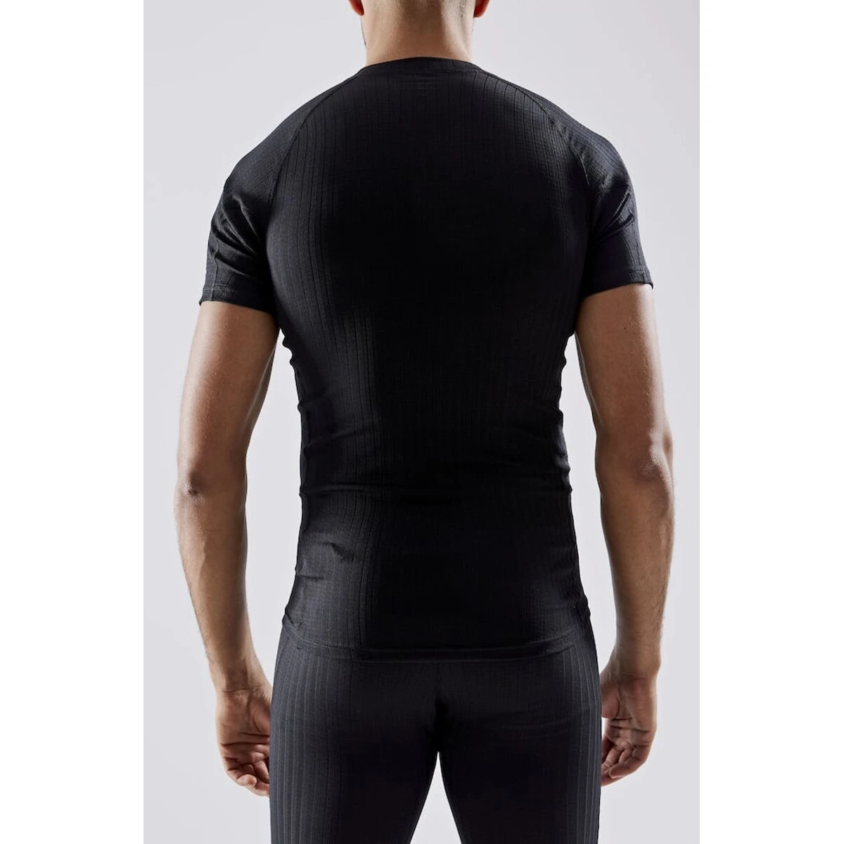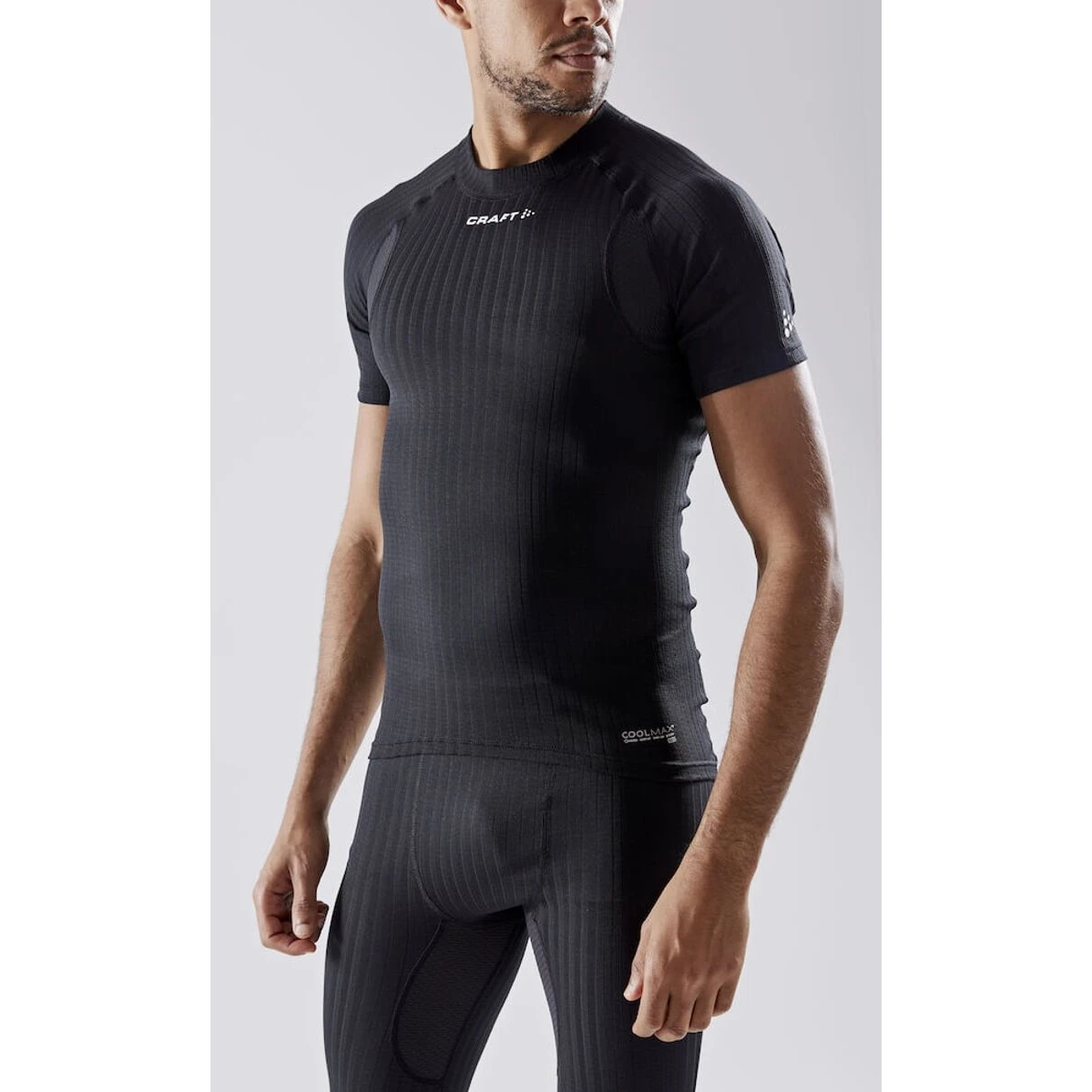 Herren Funktions-Kurzarm-T-Shirt Active Extreme X Ss von Craft , hergestellt aus hochwertigem Material, das Komfort und hohe Atmungsaktivität kombiniert, ist für intensive sportliche Aktivitäten bei kälteren Bedingungen konzipiert. Das T-Shirt hat einen ergonomischen Schnitt mit flachen Nähten für maximalen Komfort und die Mesh-Einsätze im Achselbereich garantieren eine optimale Wärmeregulierung. Die auf der Innenseite des Stricks platzierte Polyesterfaser Coolmax garantiert eine hervorragende Schweißableitung und einen kühlenden Effekt.