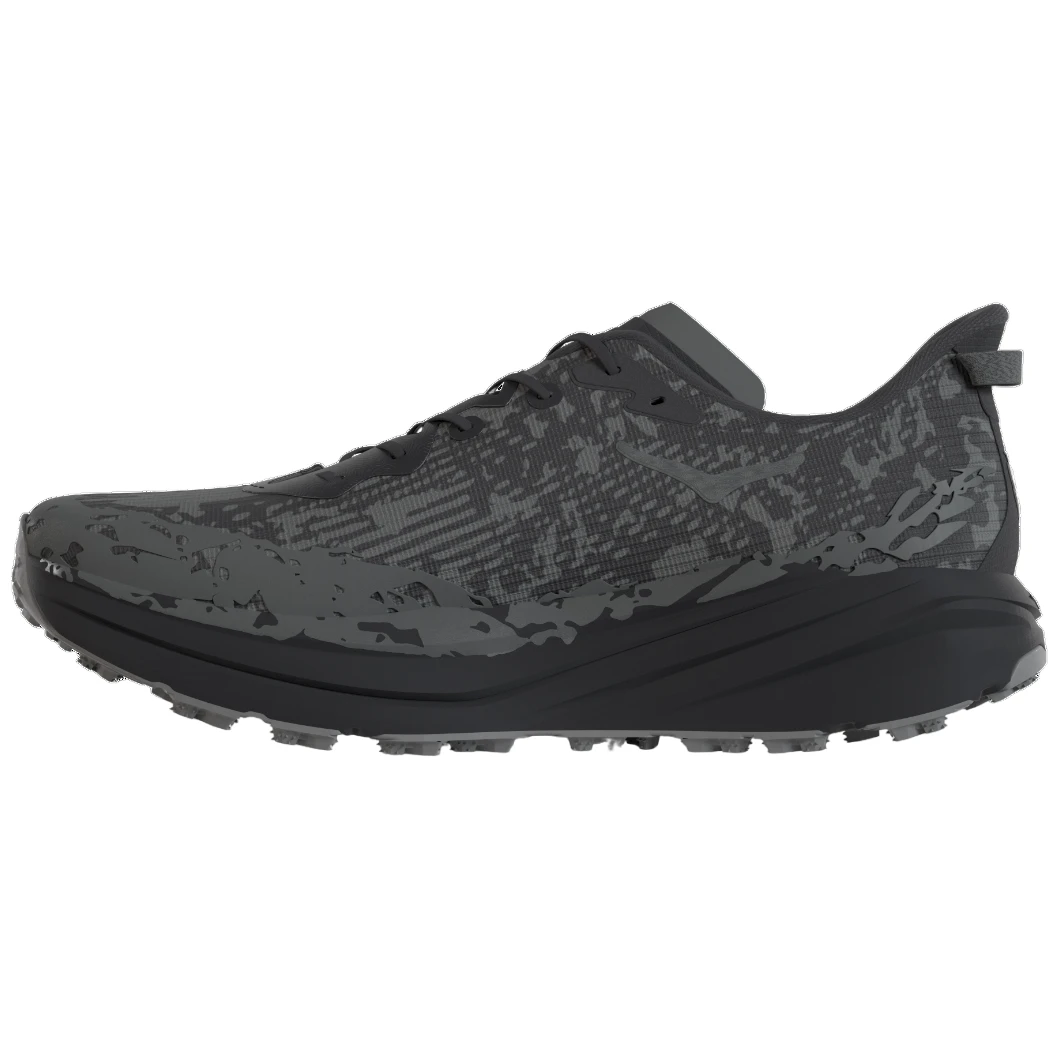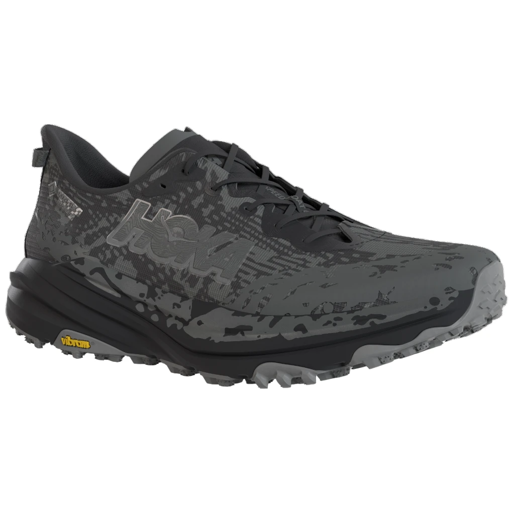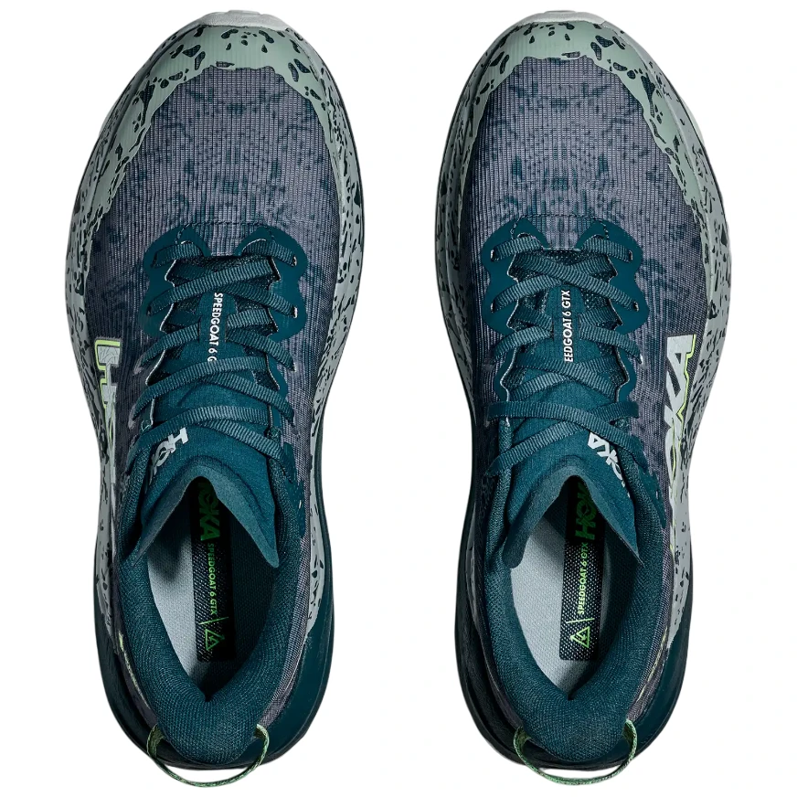Der Speedgoat 6 GTX Laufschuh der Marke Hoka ist für technische Trailskonzipiert. Die 6. Generation kehrt mit geringem Gewicht und großartiger Traktionzurück. Dieser Schuh verfügt von der Sohle bis zu den Schnürsenkeln über eine Vibram® Megagrip-Zwischensohle mit Traction Lug für besseren Halt auf losem Untergrund. Der Speedgoat 6 behält die gleiche Sohlenhöhe und Rockerform (Krümmung der Sohle) bei, verwendet eine leichtere Mittelsohlenmischung und ein dickeres zweilagiges Jacquard-Netz, das auf jedem Gelände Vertrauen vermittelt.