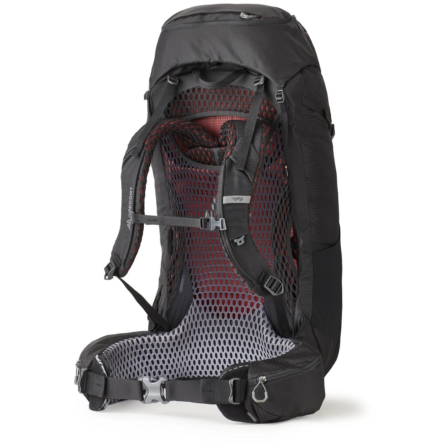 Der Rucksack hat eine sehr gut zugängliche Haupttasche. Der Zugang erfolgt über den oberen Eingang, den vorderen U-förmigen Eingang, einen langen seitlichen Eingang und den unteren Eingang, wo eine separate Tasche geschaffen werden kann, die durch eine herausnehmbare Trennwand abgetrennt ist. Im Inneren der Haupttasche befindet sich zudem eine Vorbereitung für Trinkblasen Gregory. Die zwei Taschen am Hüftgurt und die drei Taschen auf dem Deckel des Rucksacks eignen sich optimal zum Verstauen kleiner Gegenstände, die du schnell zur Hand haben möchtest. Zwei außen, einer innen. Auf der Vorderseite und einer Seite des Rucksacks befinden sich praktische und leicht zugängliche elastische Taschen, beispielsweise für eine Trinkflasche, eine Karte oder eine leichte Jacke. Zudem ist auf der anderen Seite eine Tasche für eine Trinkflasche vorhanden, die bequem mit einer Hand erreichbar ist, ohne den Rucksack vom Rücken nehmen zu müssen. Der Rucksack verfügt außerdem über mehrere praktische Schlaufen, an denen sich nicht nur Trekkingstöcke, sondern auch andere Ausrüstung befestigen lässt, und am Schultergurt befindet sich zusätzlich eine Sicherheitsschlaufe zum Anbringen einer Sonnenbrille.