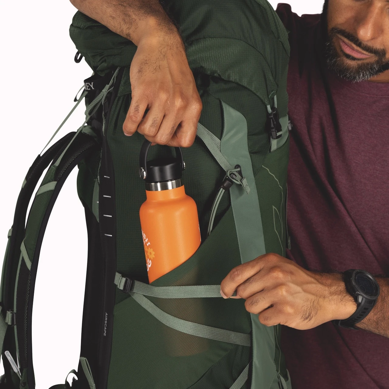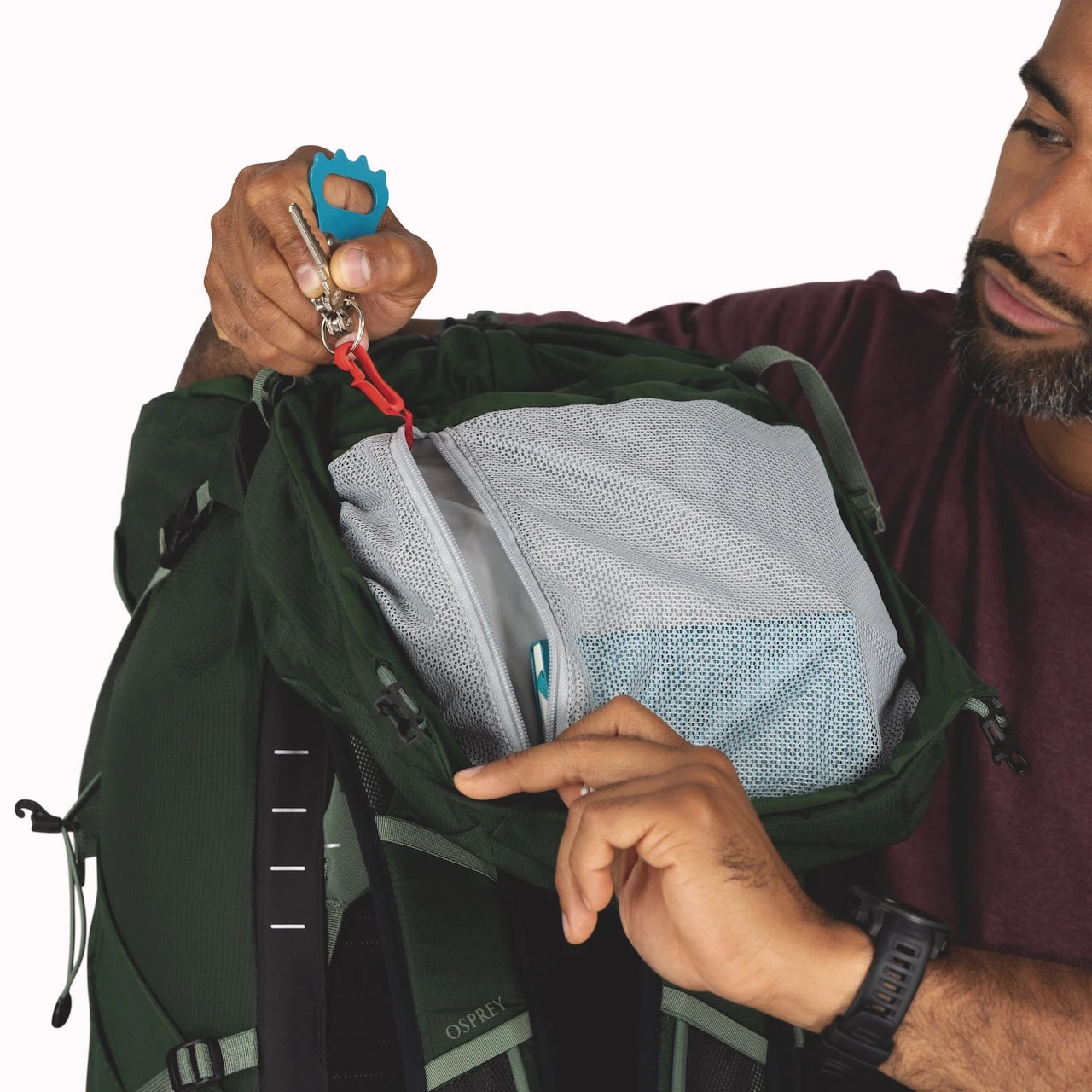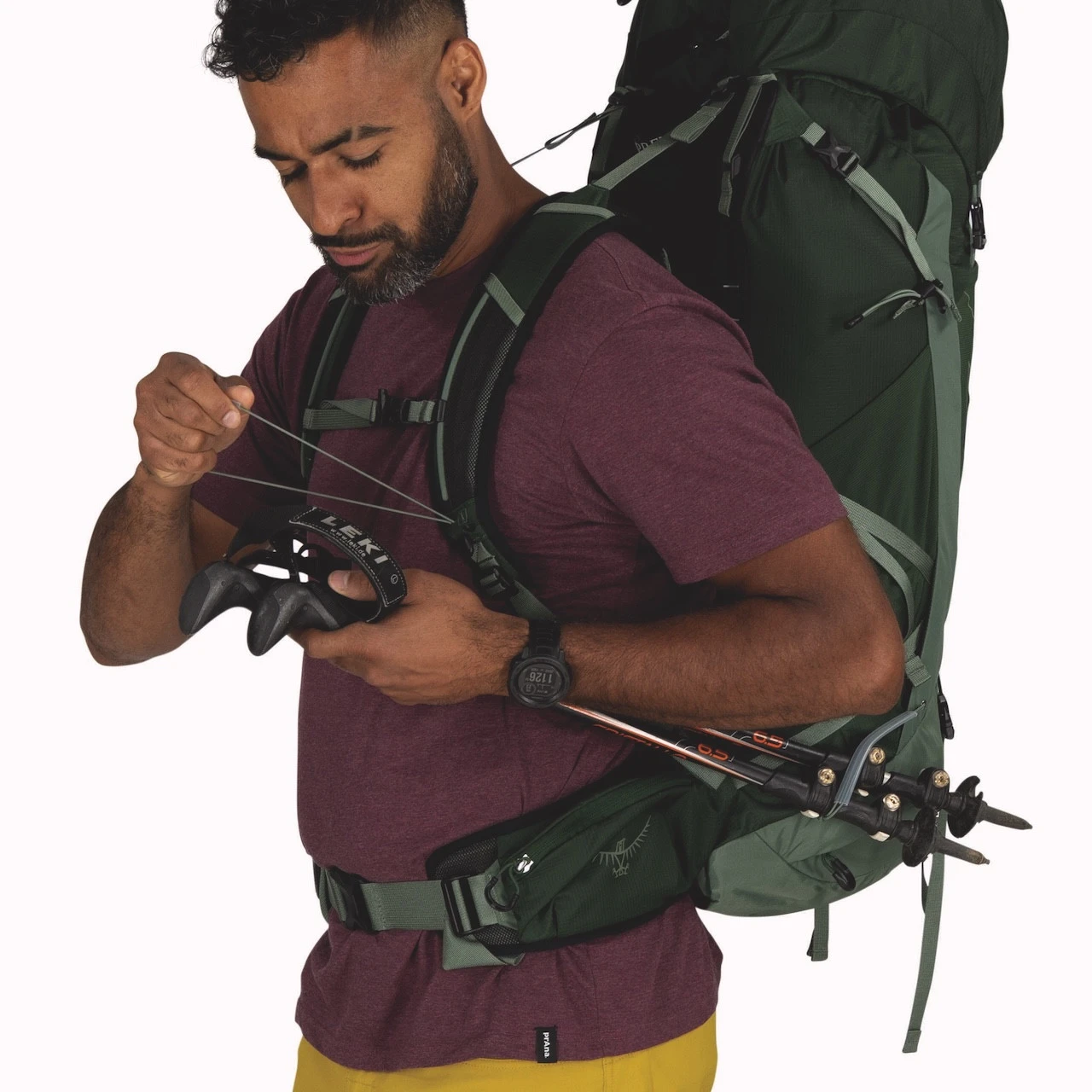 Top-Loading mit Deckel und Kordelzug ermöglicht einfachen Zugriff auf das Innere durch eine weite Hauptöffnung; im Inneren finden Sie eine große Kammer. Das zweite Reißverschlussfach befindet sich ganz unten und eignet sich optimal für einen Schlafsack. Der Rucksack verfügt außerdem über eine von außen zugängliche obere Reißverschlusstasche , eine Reißverschlusstasche aus Netzmaterial mit einem Schlüsselclip im Inneren, eine Trinkblasentasche, Seitentaschen, eine große Vordertasche und zwei Reißverschlusstaschen am Hüftgurt. Riemen an der Außenseite ermöglichen die Befestigung einer Isomatte und eines Eispickels. Beim Wandern werden Sie das Stow-On-The-Go-Schnellverschlusssystem für Trekkingstöcke sicherlich zu schätzen wissen. Selbstverständlich sind an den Seiten Kompressionsriemen vorhanden, die das Volumen des Rucksacks auf ein Minimum reduzieren.