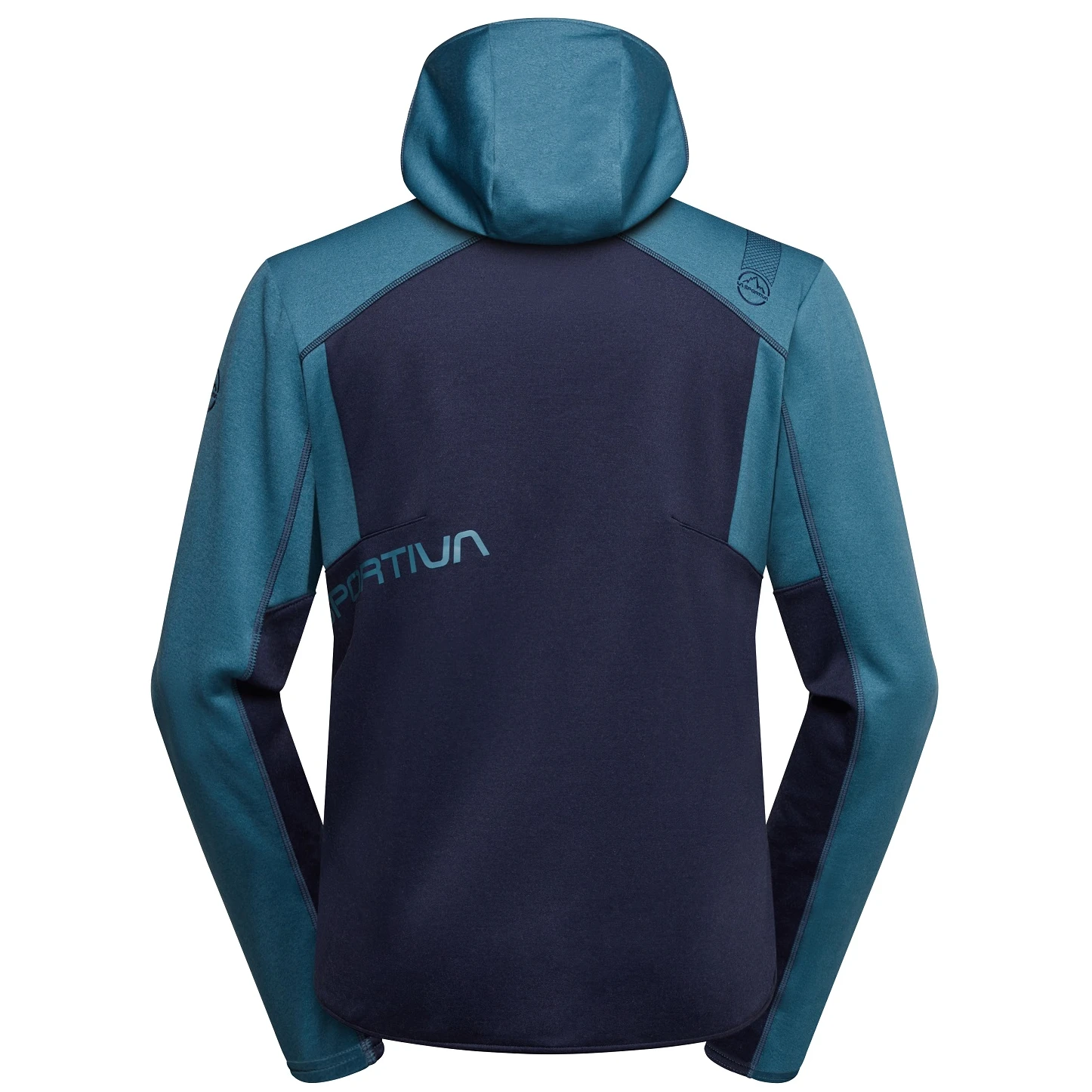 Herren-Sweatshirt La Sportiva Cosmic Hoody M besteht aus TechStretch™ Pro II-Gewebe, das aus einer Kombination von recycelten Materialien und Naturfasern hergestellt wird. Das Material ist warm, atmungsaktiv und sehr dehnbar. Das gebürstete Innenmaterial hält Sie bei kaltem Wetter warm . Die anatomisch geformte Kapuze eignet sich auch zum Tragen unter einem Helm. Flachnähte verringern die Entstehung unangenehmer Druckstellen. In den zwei Reißverschlusstaschen können Sie alles verstauen, was Sie brauchen. Die antibakterielle Behandlung verhindert das Wachstum und die Vermehrung von Bakterien, die unangenehme Gerüche verursachen.