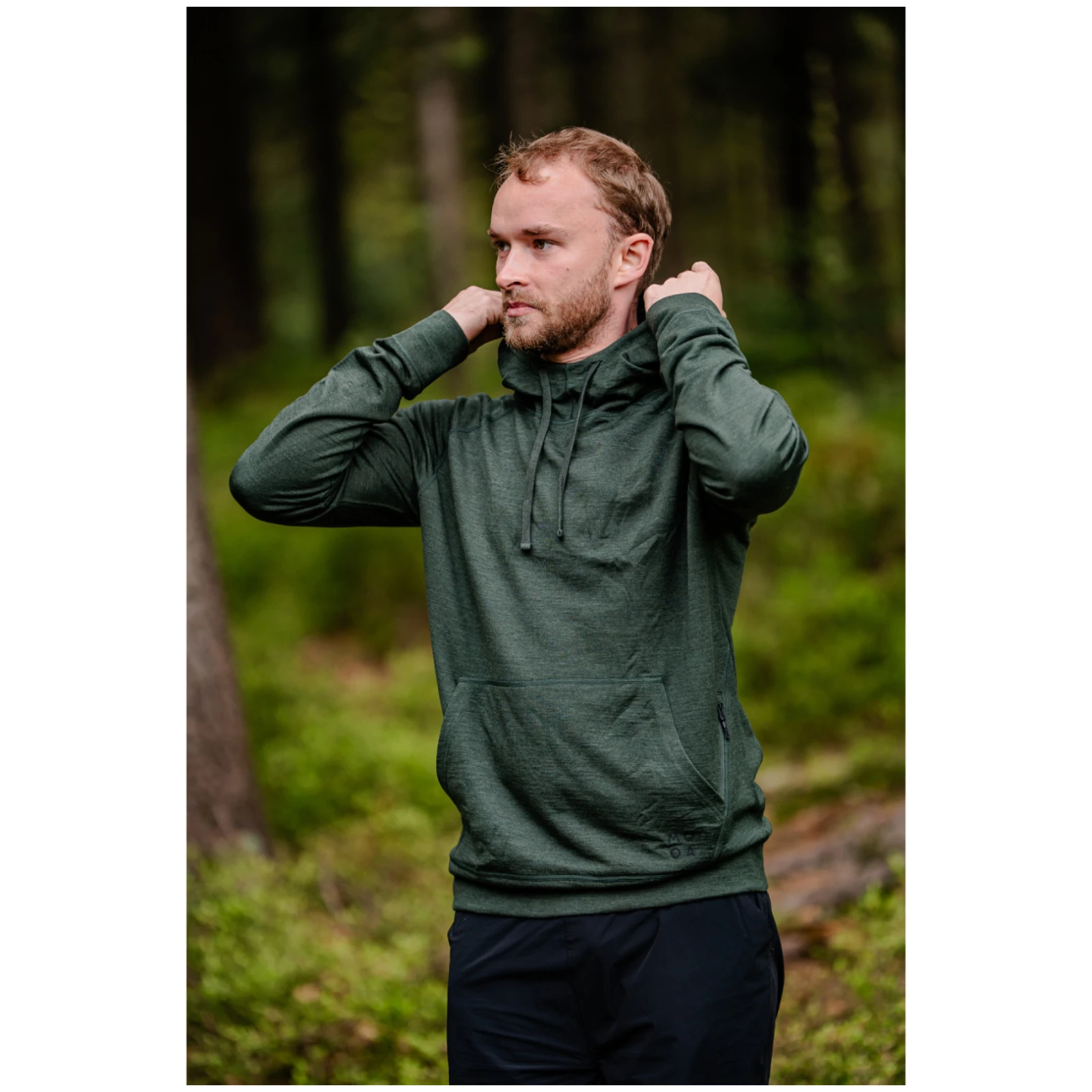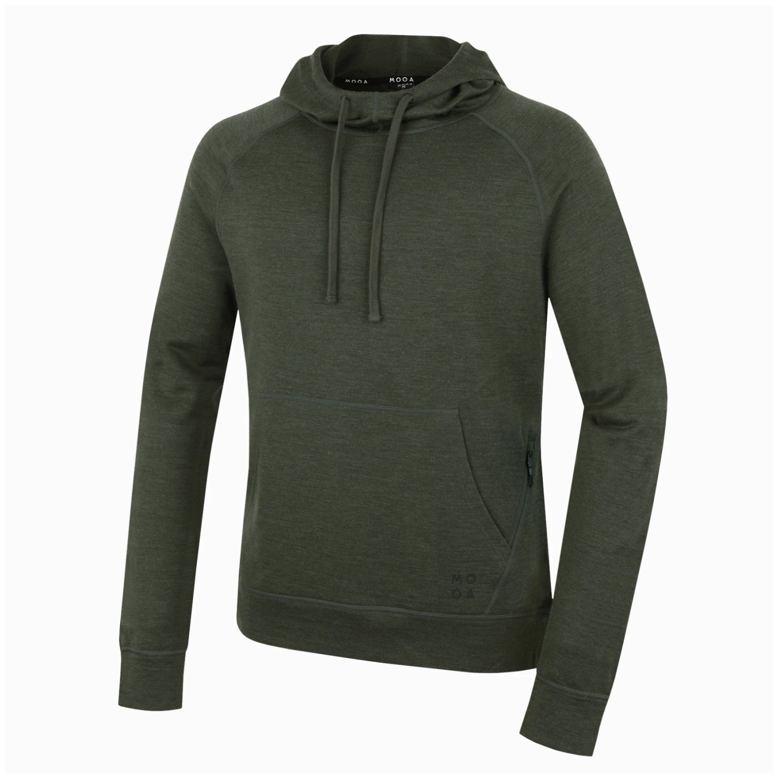 Der Merino Hoodie für Herren von MOOA fühlt sich dank der Premium-Merinowolle angenehm auf der Haut an. Der Hoodie hat eine Kängurutasche für die Hände und eine Innentasche mit Reißverschluss. Flache Nähte sorgen für hohen Tragekomfort. Merinowolle ist antibakteriell und sorgt für einen Feuchtigkeitstransport, daher ist sie auch bei anstrengenderen Aktivitäten sehr komfortabel. Perfekt als zweite Schicht beim Wandern und im Alltag das ganze Jahr über.
