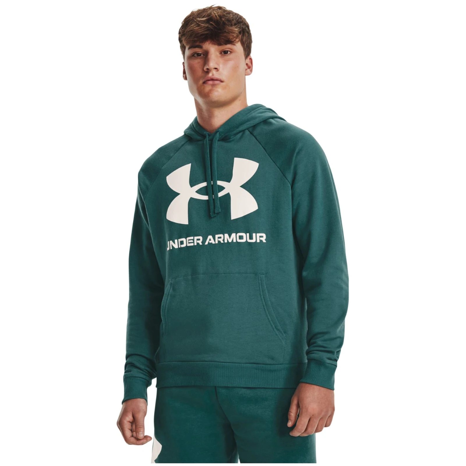 Herren Sweatshirt Rival Fleece Big Logo HD der Marke Under Armour ist ein extra weiches Sweatshirt für vielfältige Einsatzmöglichkeiten. Mittelschweres Fleecegewebe mit hohem Baumwollanteil und angerauter Innenseite sorgt für noch mehr Wärme. Sehr schön ist die verstellbare Kapuze mit überkreuztem Kragen. Vordere Kängurutasche für kleine Gegenstände. Das Sweatshirt hat gerippte Bündchen und Saum sowie Raglanärmel.