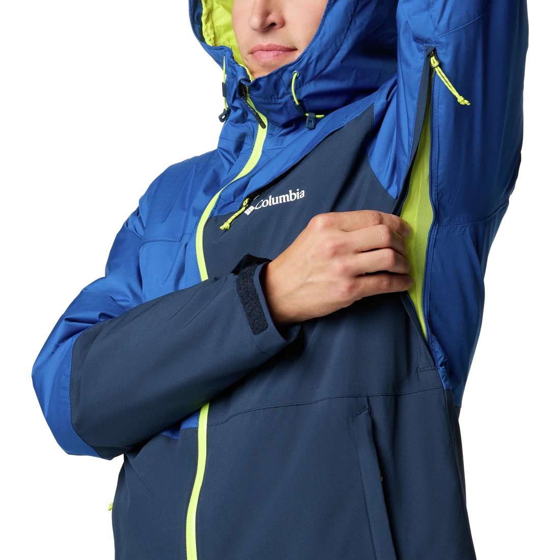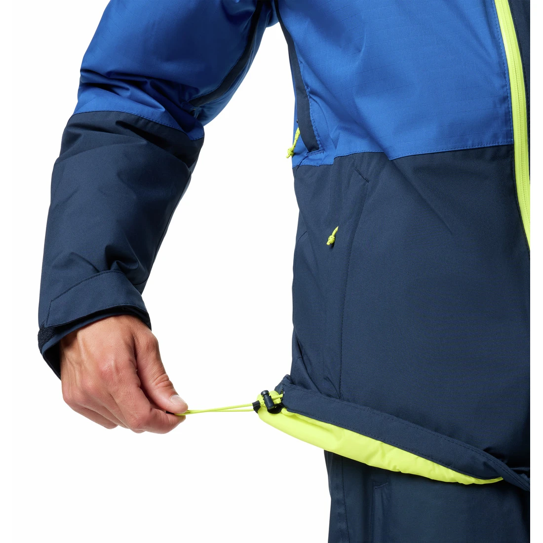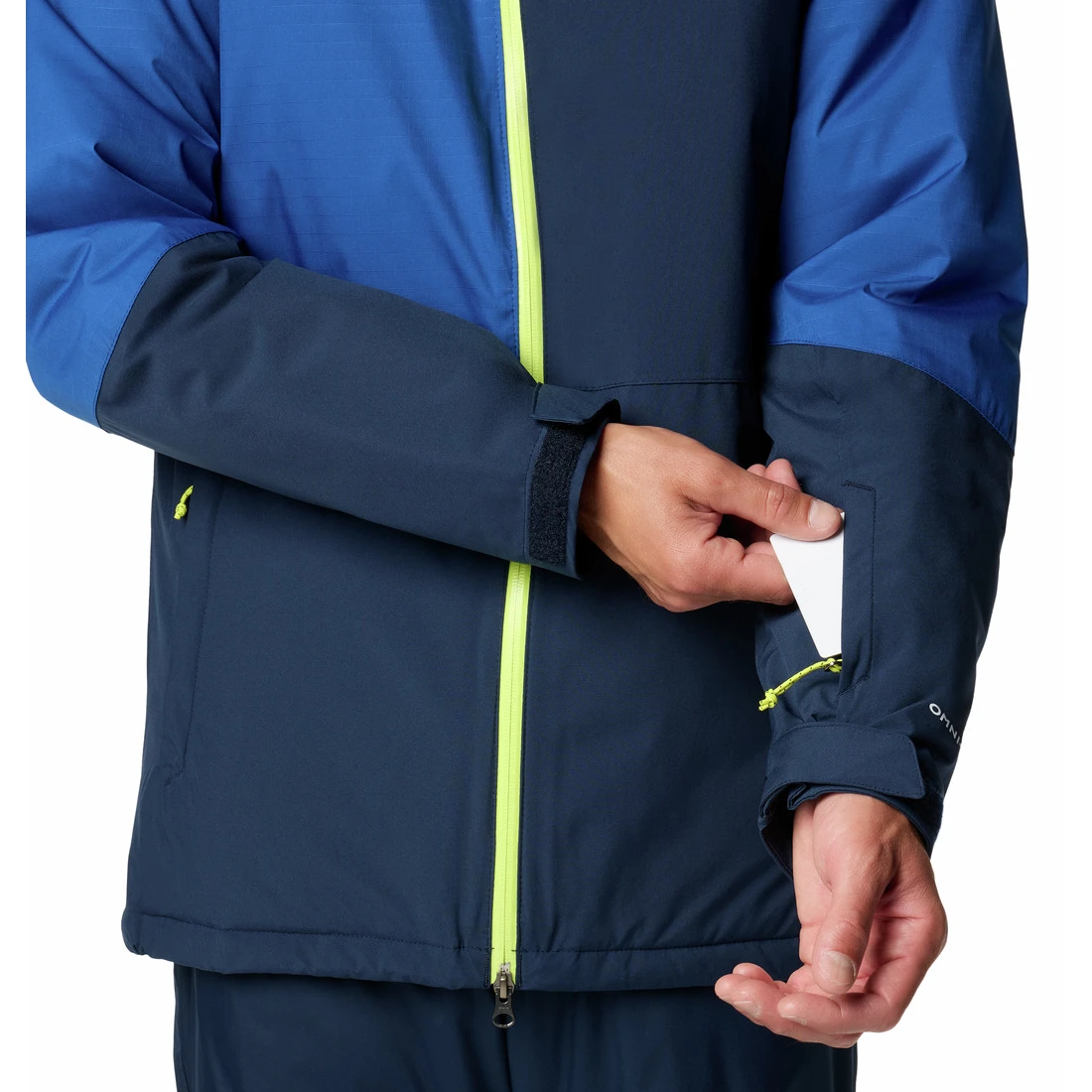 Zu den Grundausstattungen beim Skifahren gehören eine Unterarmbelüftung zur Temperaturregulierung, ein Kinnschutz, eine Skipasstasche und ein Schneefang mit verstellbaren Details, der das Eindringen von Schnee verhindert. Die Jacke verfügt außerdem über einen mit Polyurethan beschichteten Frontreißverschluss für erhöhte Wasserfestigkeit, verstellbare Bündchen und einen verstellbaren Saum mit Kordelzug. Stauraum bieten Reißverschlusstaschen, eine interne Sicherheitstasche und eine Brusttasche zur Aufbewahrung wichtiger Dinge.