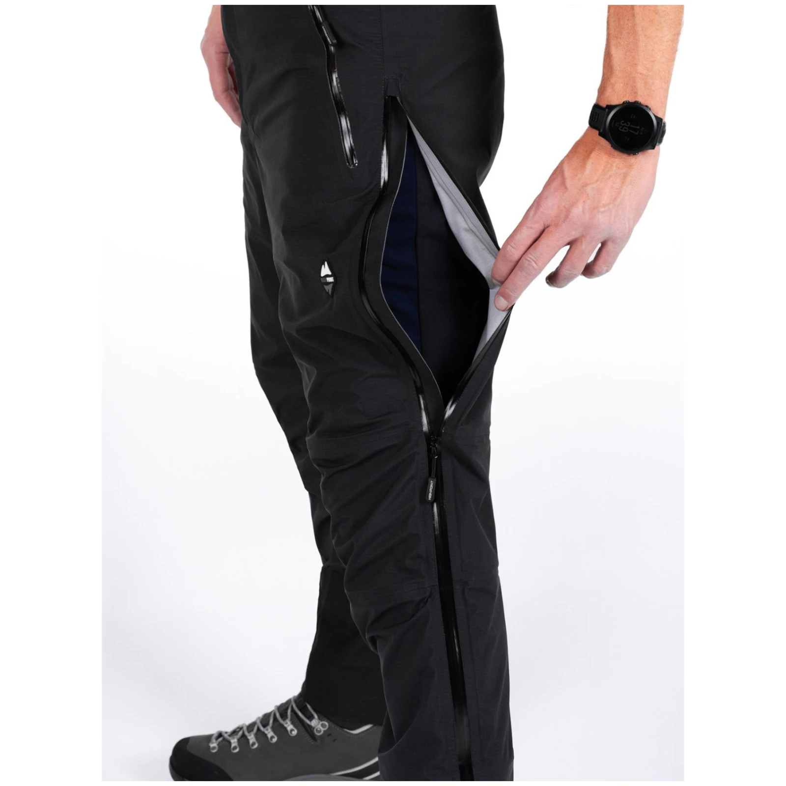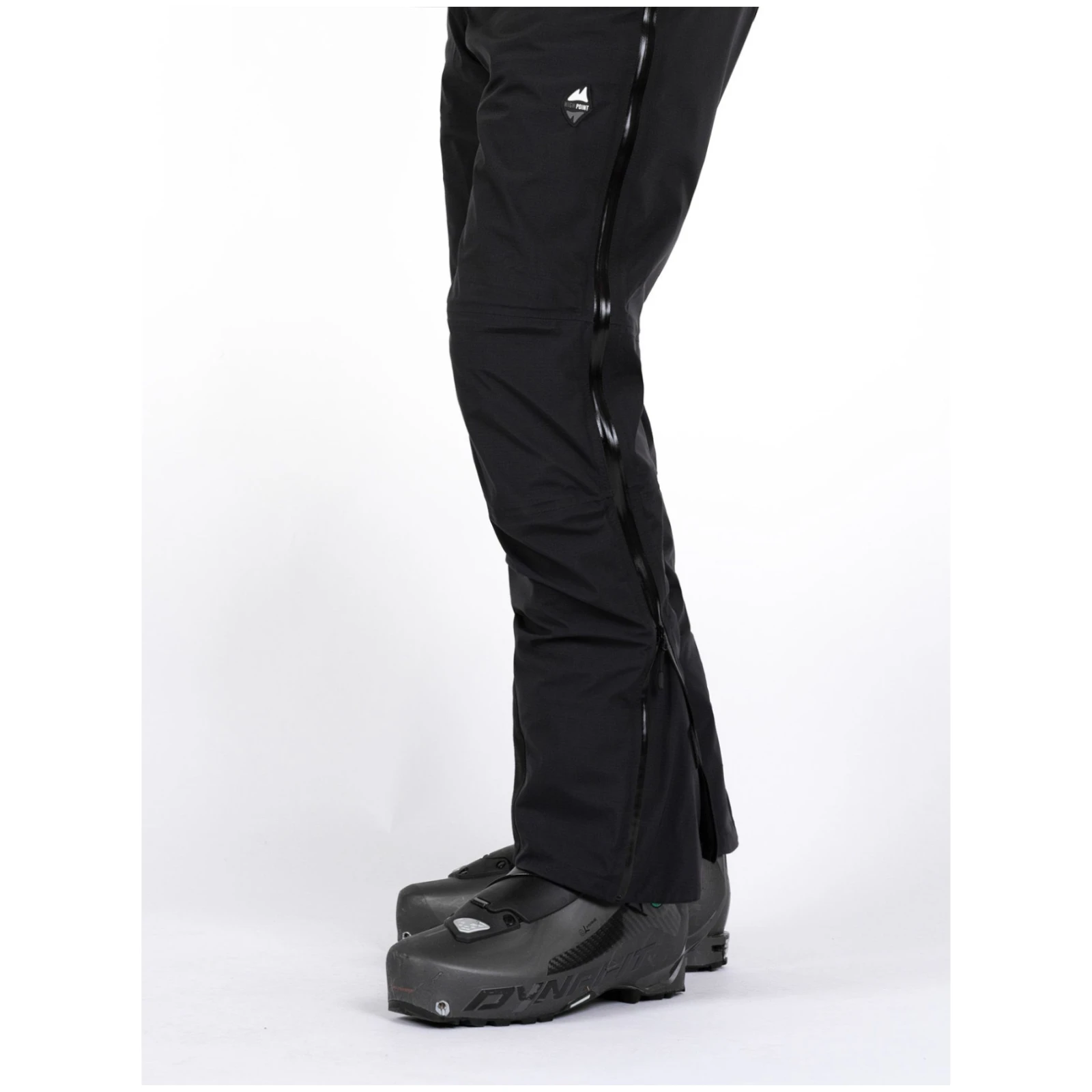 Zwei große Seitentaschen mit Reißverschluss bieten ausreichend Platz für alles Notwendige. Im unteren Bereich verfügen die Hosen über einen praktischen Zwickel, der eine Erweiterung ermöglicht. Das bedeutet, dass die Hosenbeine problemlos über Skitourenschuhe passen. Die Innenseite des unteren Saums ist mit einem Schutzmaterial verstärkt, das Beschädigungen durch Skikanten oder angebrachte Steigeisen verhindert.