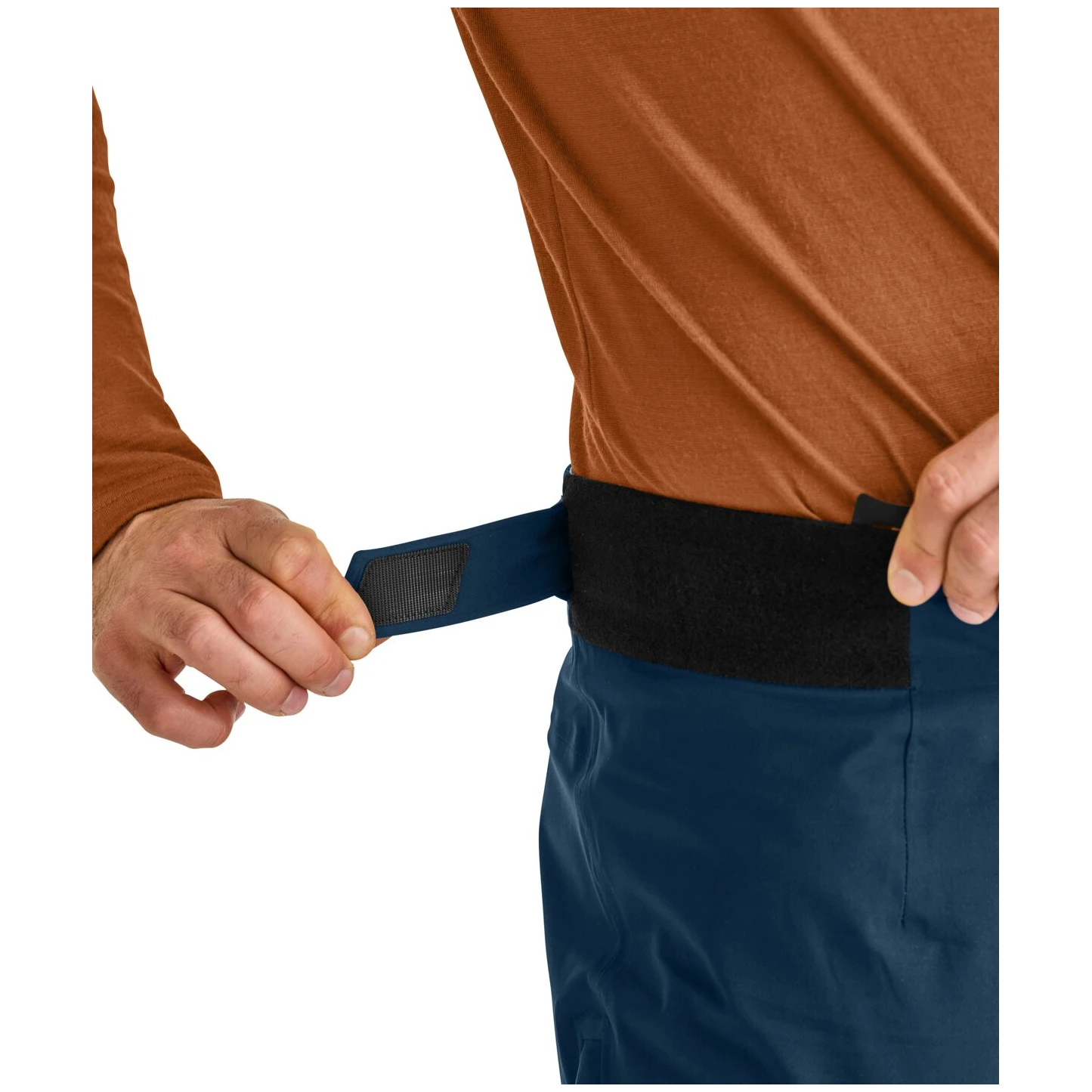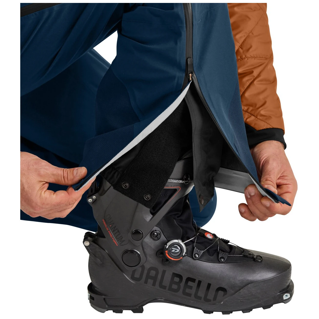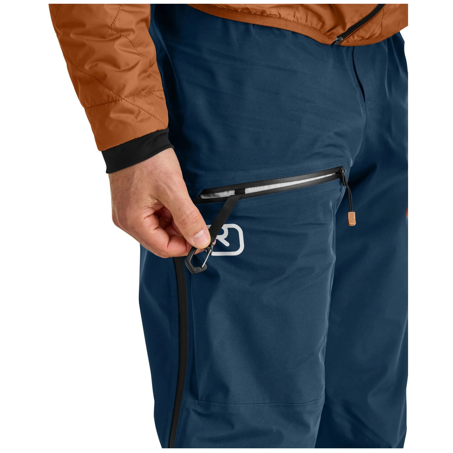 Am rechten Bein befindet sich eine 3D-Tasche für ein LVS-Gerät, die Sie mit sichern können integrierte Kunststoffkarabiner. Der wasserdichte Reißverschluss bildet den Beinabschluss des Sitzgurtes nach, so dass dieser nicht drückt und du auch durch den Sitzgurt hindurch an die Tasche kommst.
