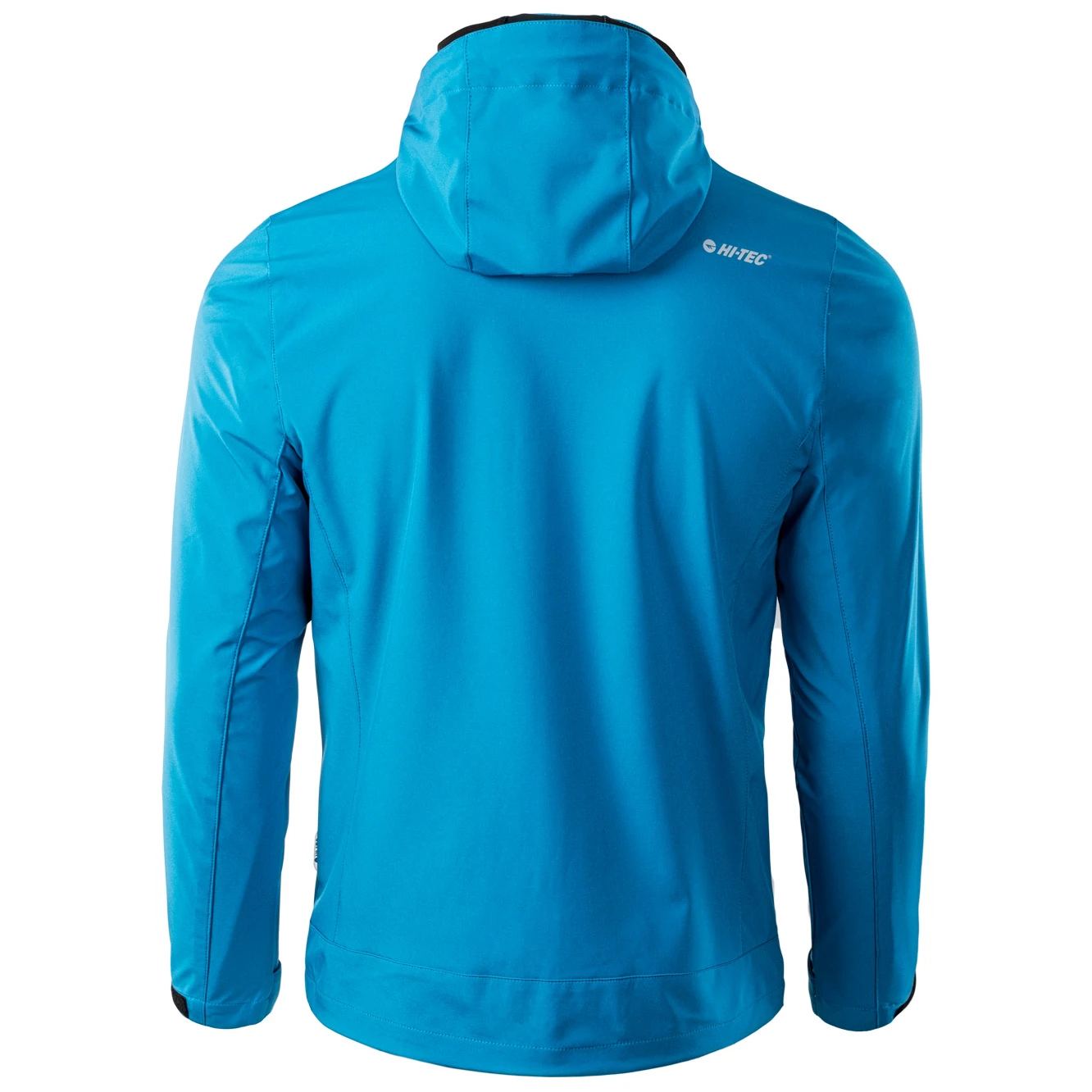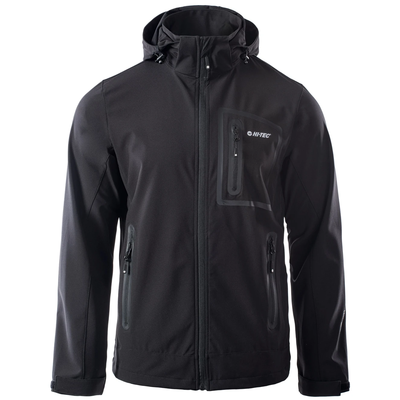 Dünne Herren Outdoorjacke Nick vom Hersteller Hi-Tec aus Softshell mit abnehmbarer und verstellbarer Kapuze, praktischen Eingrifftaschen, Innentaschen für Dokumente oder Geldbörse, äußerer Brusttasche, Kordelzug in der Taille und Kordelzug an den Ärmeln. Die hohe Wassersäule von 10.000 garantiert hervorragenden Schutz vor Regen und Wind.