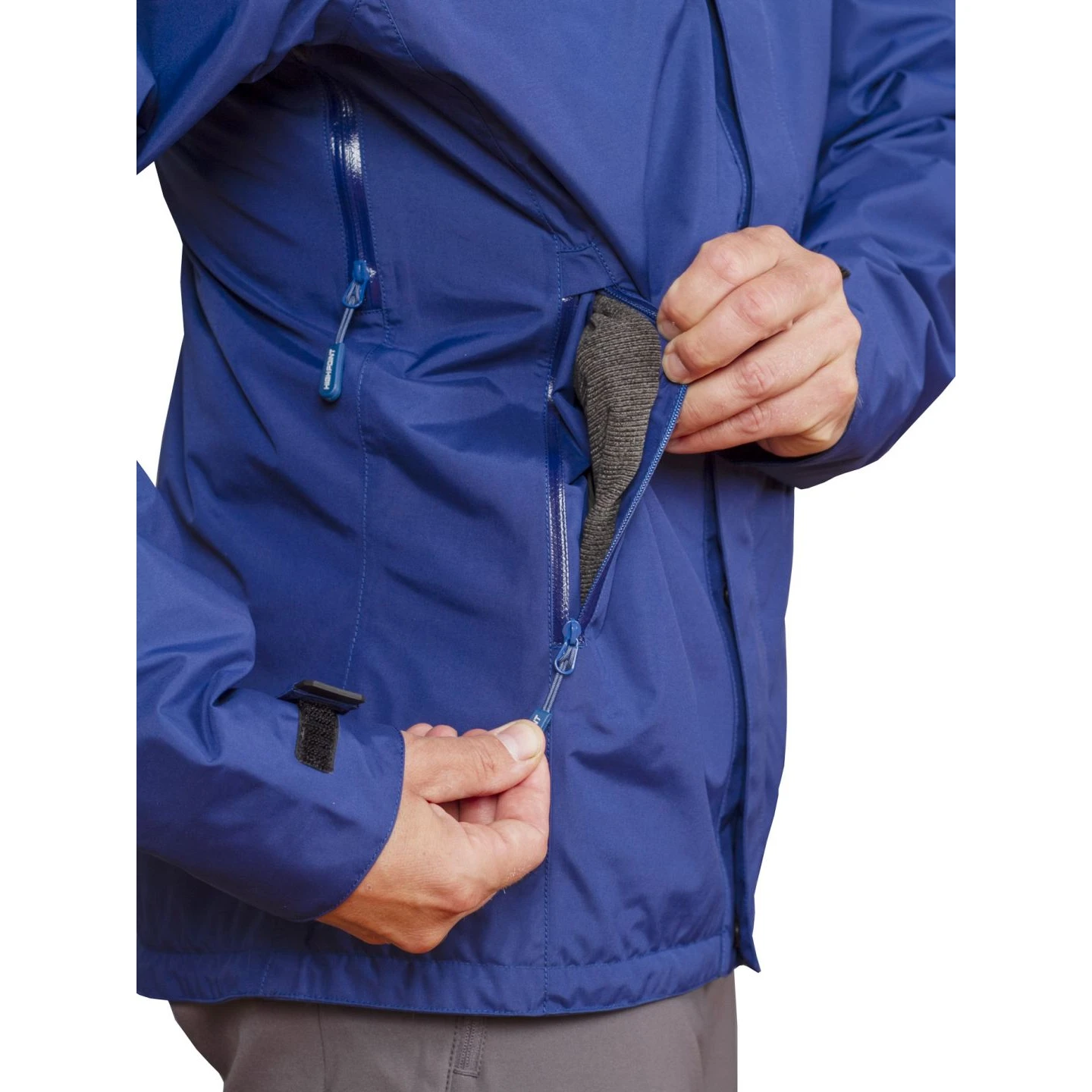 Das Jackenmaterial ist wasser- und windabweisend. Es bietet eine Wasserdichtigkeit von 20.000 mm H2O und eine Atmungsaktivität von 20.000 g/m2/24 Stunden. Zur Wasserfestigkeit trägt nicht nur das Material selbst bei, sondern auch wasserdichte Reißverschlüsse und verschweißte Nähte. Der Hauptreißverschluss ist mit einer Druckknopfklappe vor Wasser geschützt.