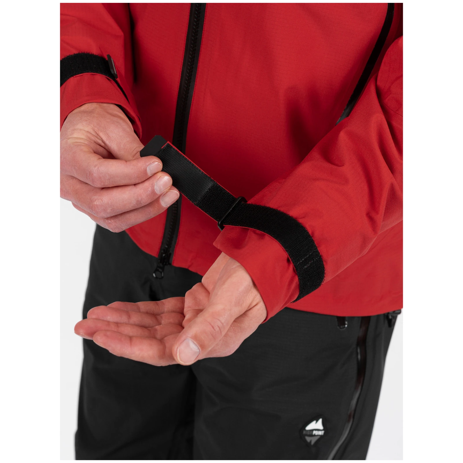Die Jacke ist mit einer helmkompatiblen Kapuze mit Drei-Wege-Verstellung ausgestattet. Die geräumigen Taschen sind so positioniert, dass sie auch mit Rucksack oder Klettergurt erreichbar sind. Eine großzügige Unterarmbelüftung hilft bei der Temperaturregulierung. Anatomisch geformte Ärmel, ein verlängertes Rückenteil und wasserdichte YKK-Reißverschlüsse verleihen der Jacke perfekte Funktionalität.