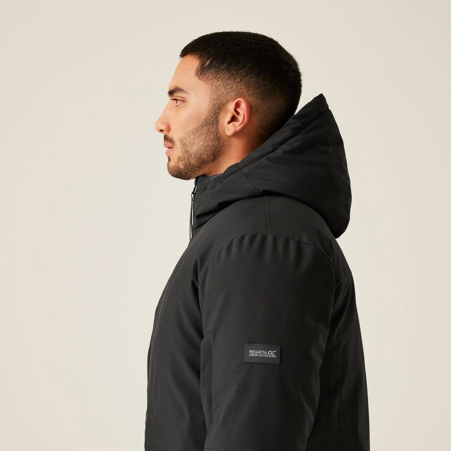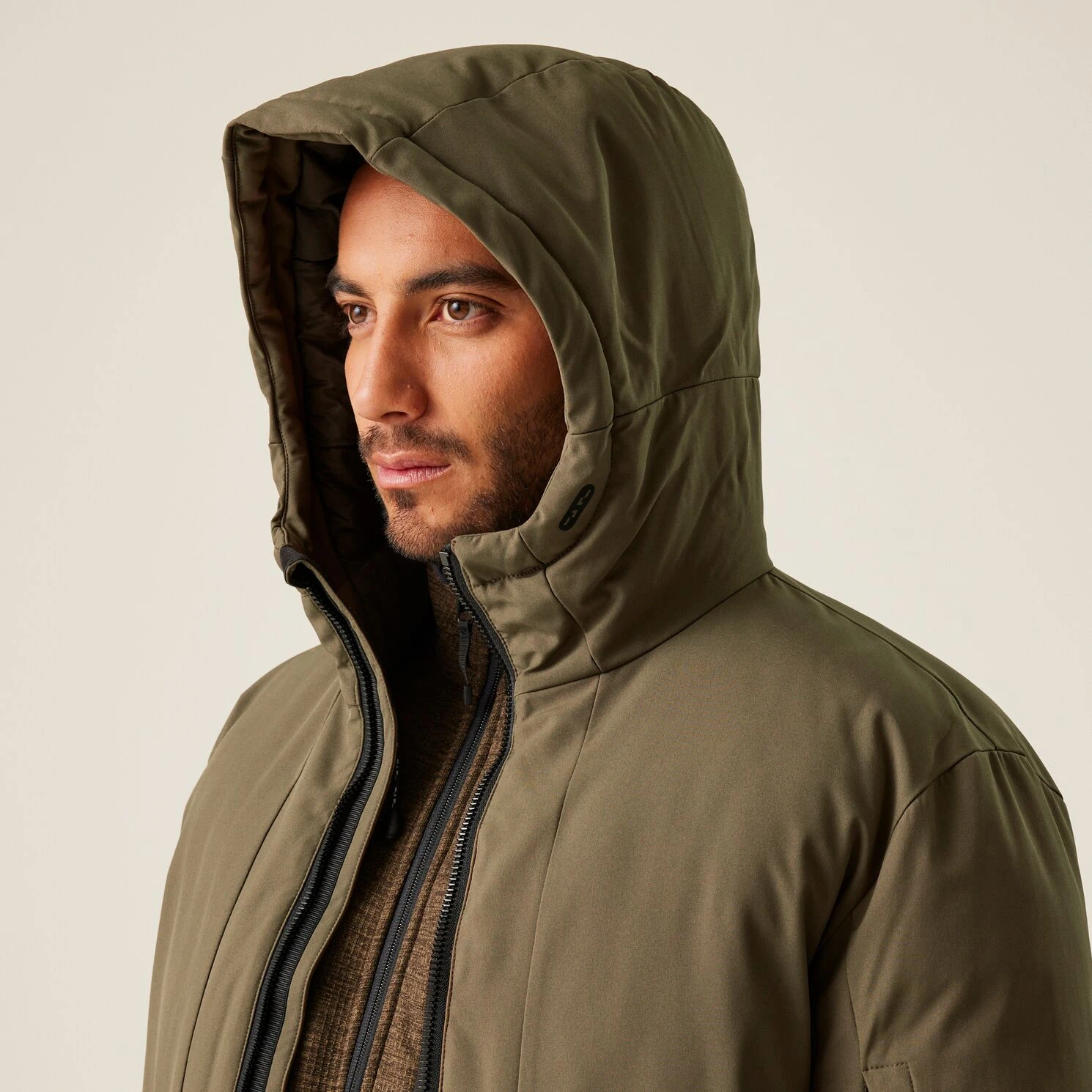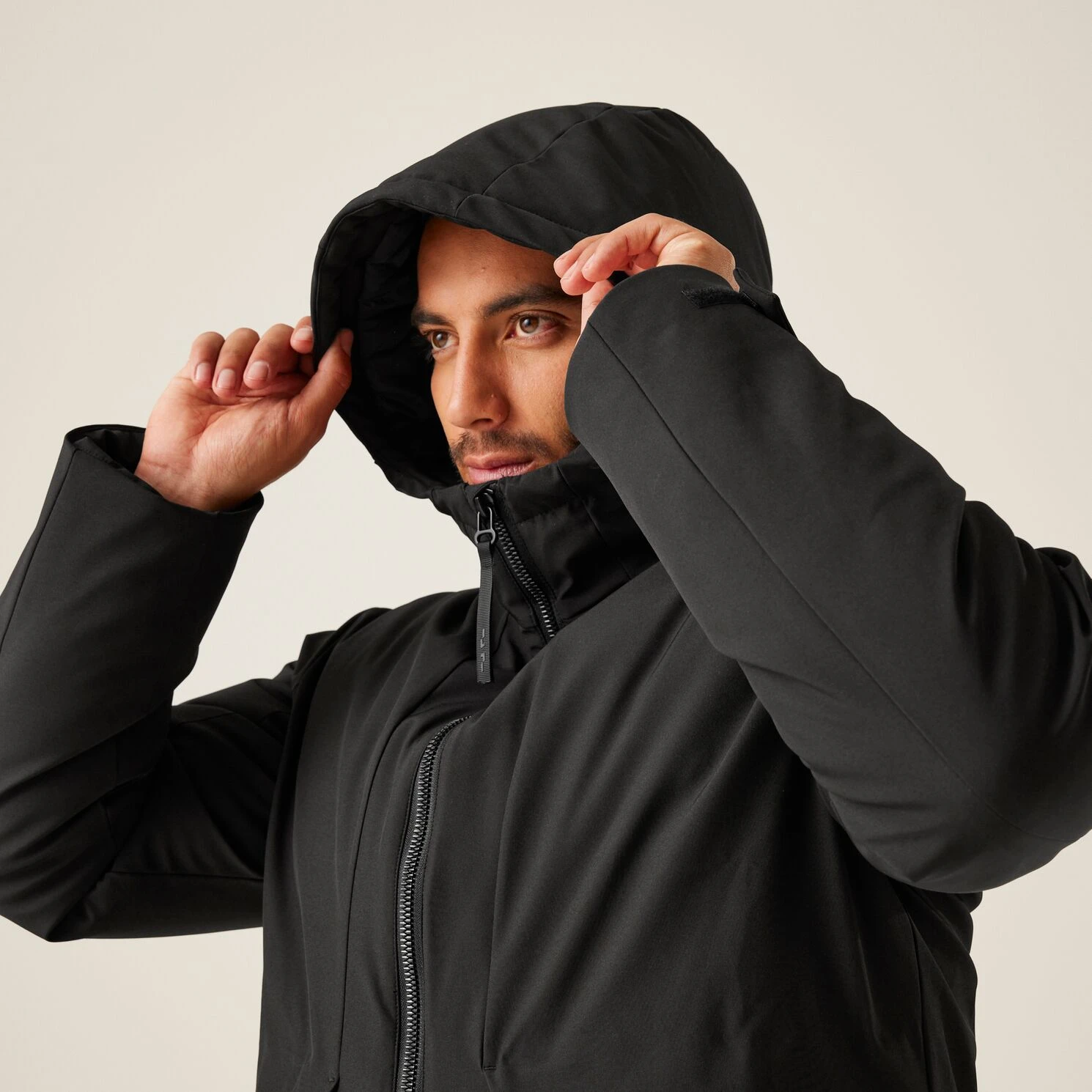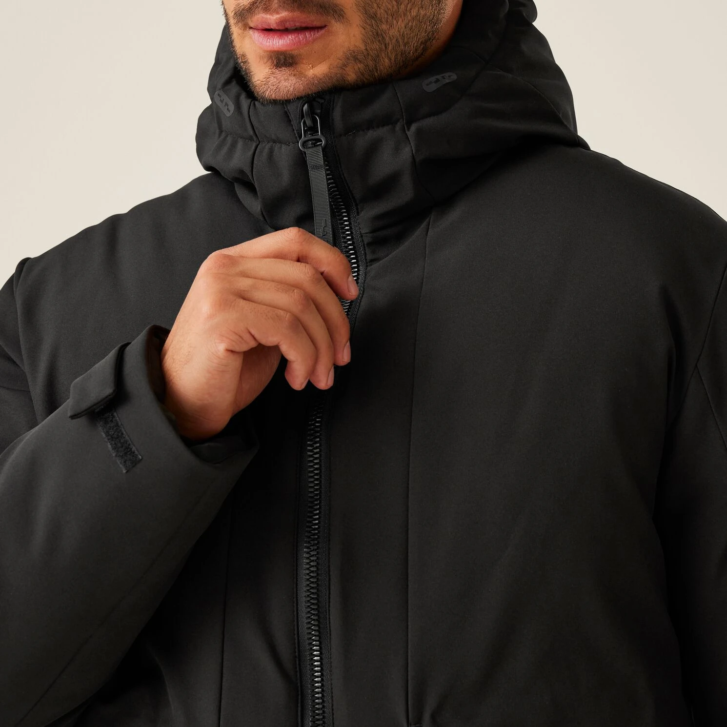 Anhebbare Kapuze mit Regulierung für besseren Schutz bei schlechtem Wetter.