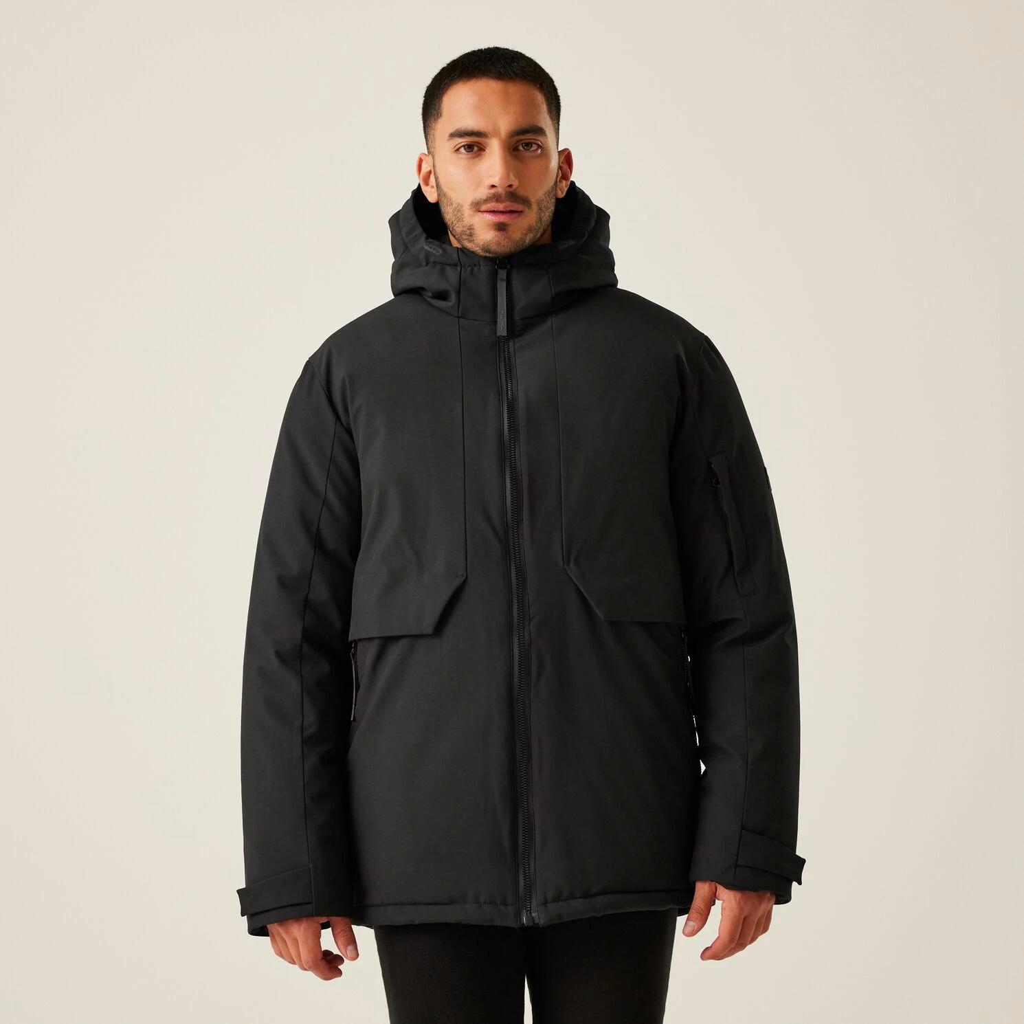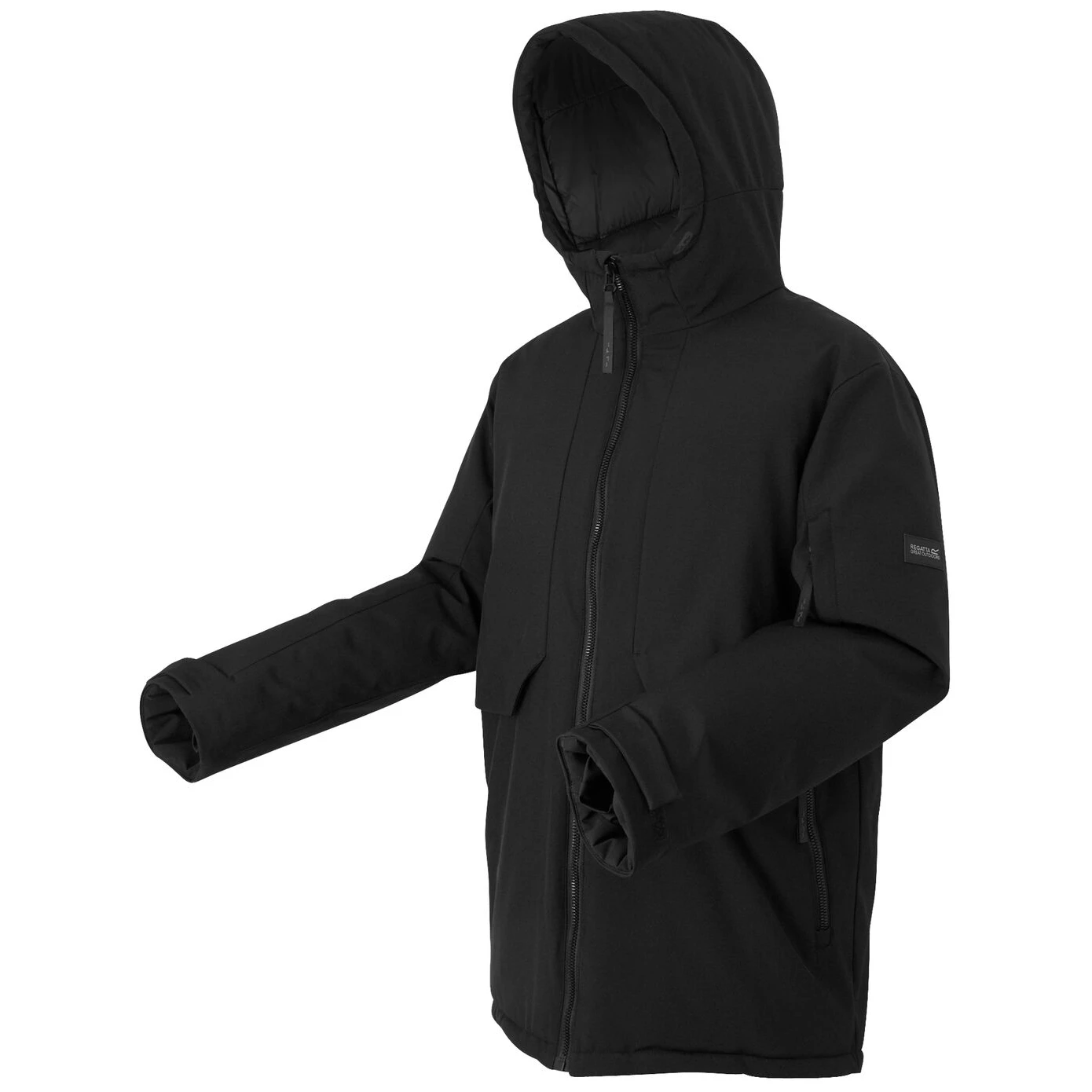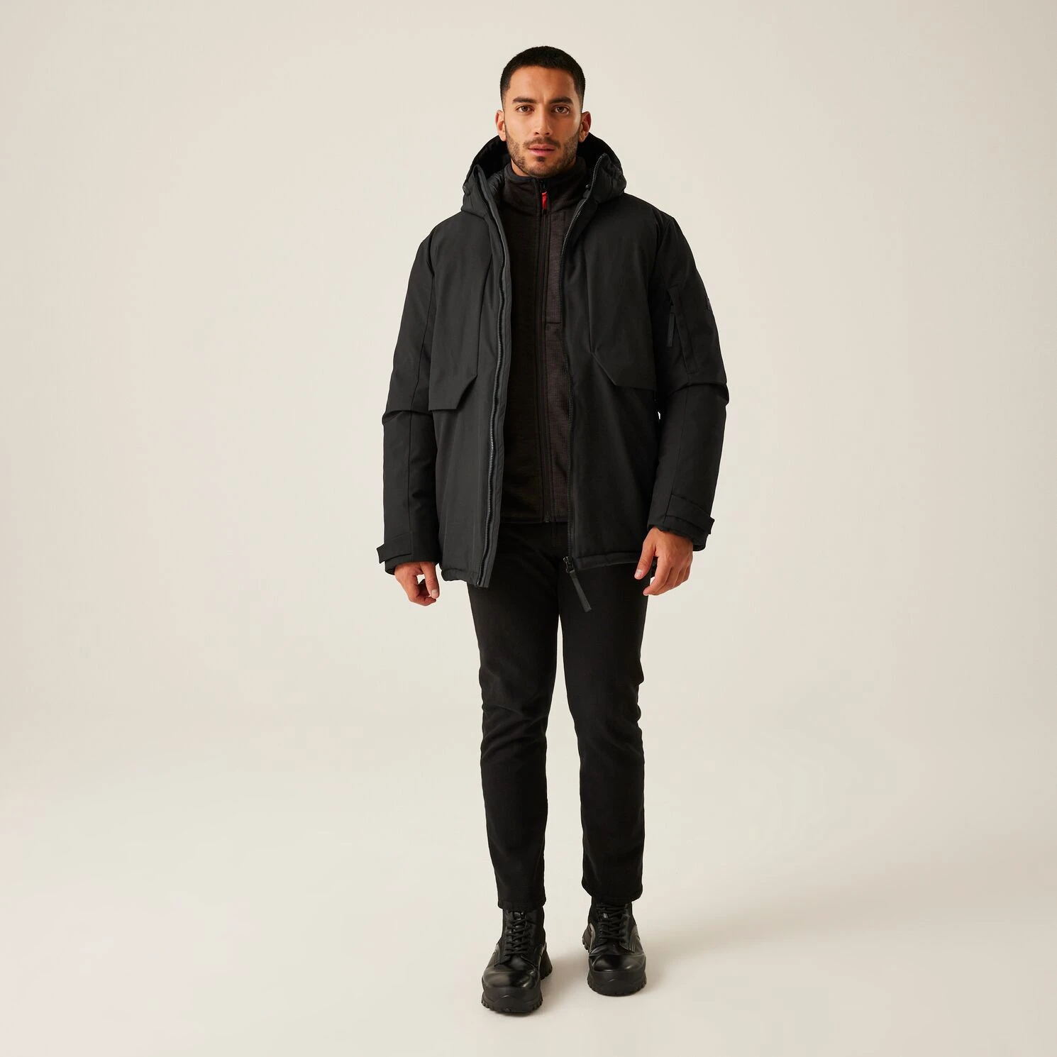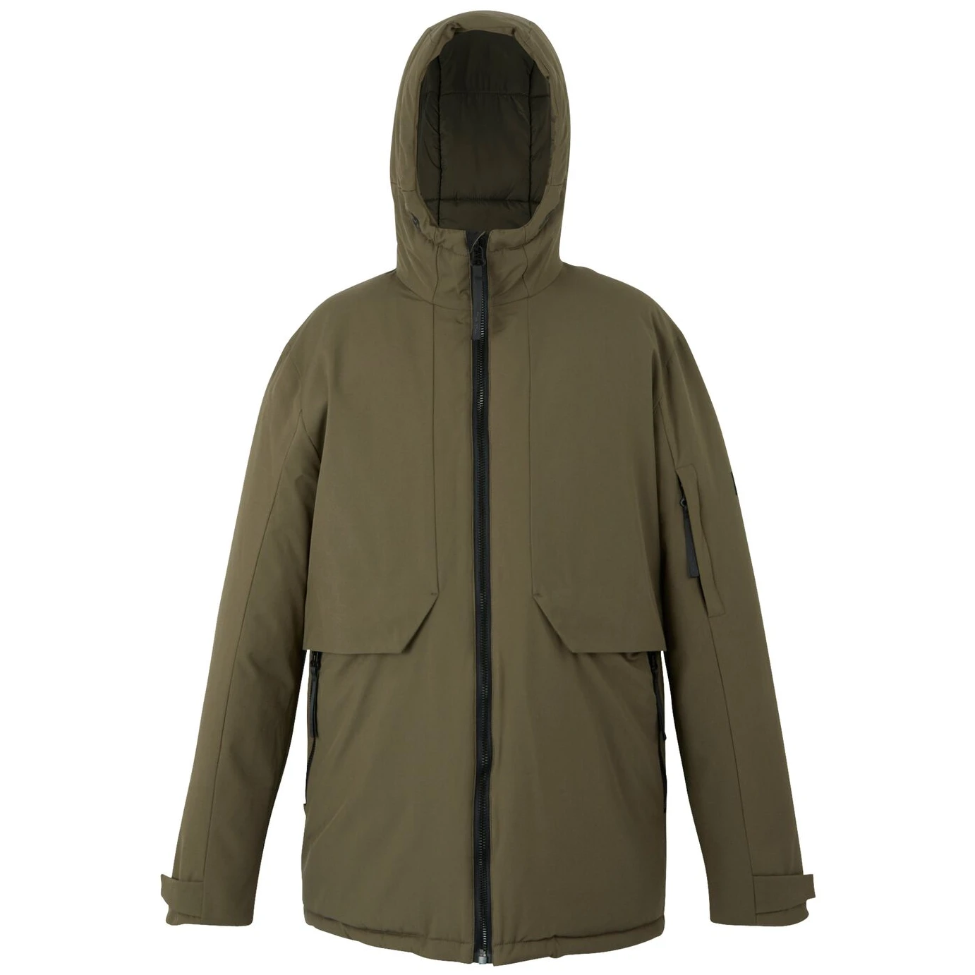 Praktische Taschen: Zwei innenliegende Sicherheitstaschen mit Reißverschluss, eine Ärmeltasche mit Reißverschluss, zwei Handwärmtaschen auf der Brust und zwei untere Reißverschlusstaschen.