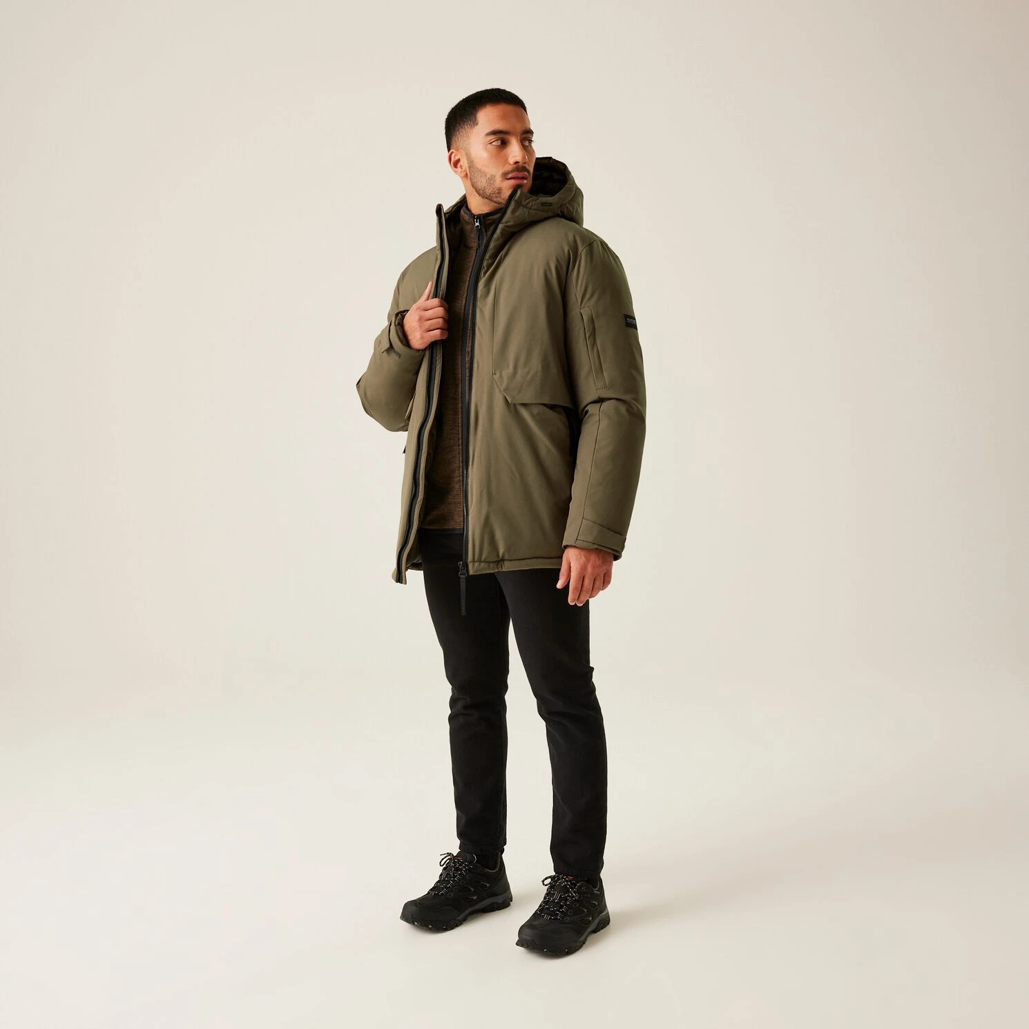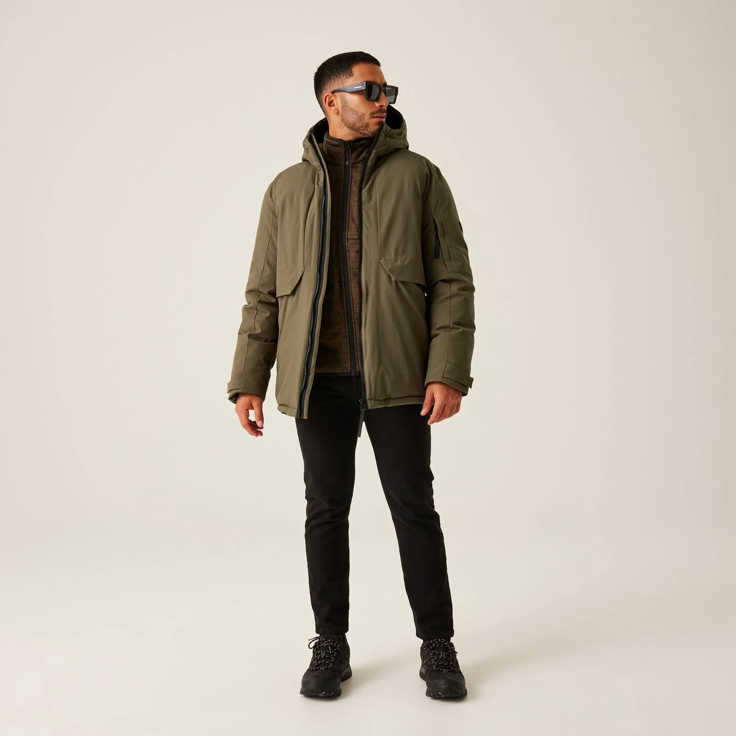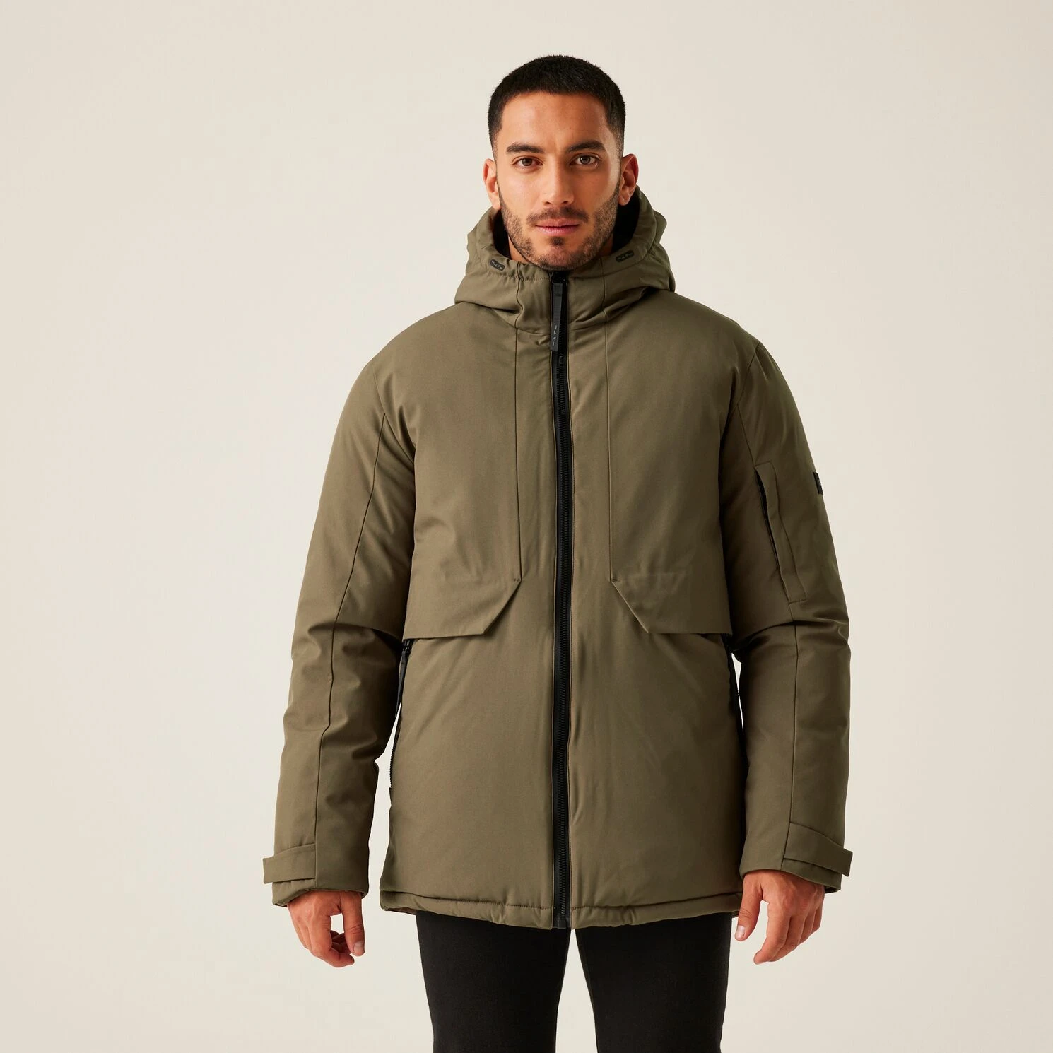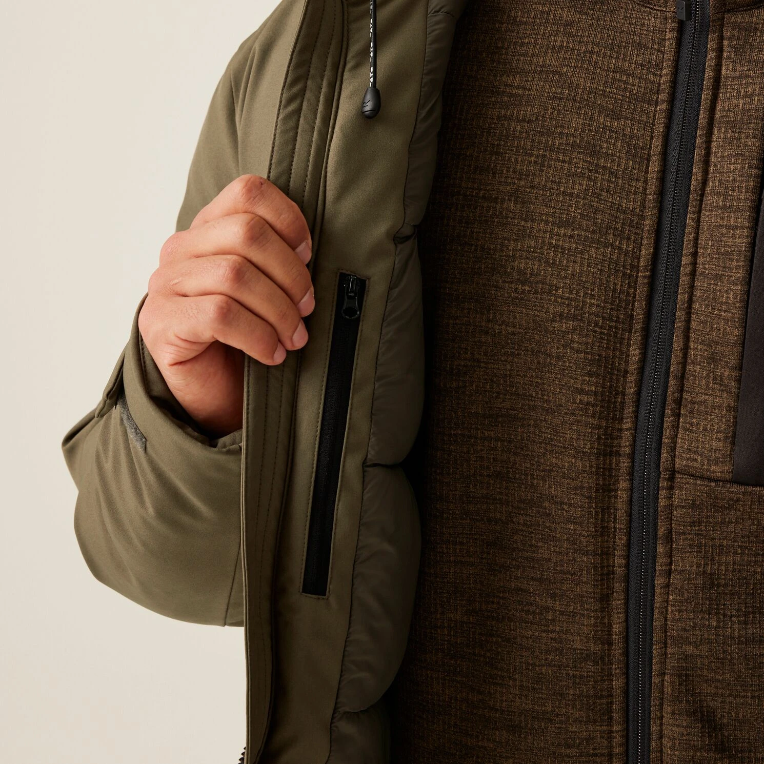 Praktische Taschen: Zwei innenliegende Sicherheitstaschen mit Reißverschluss, eine Ärmeltasche mit Reißverschluss, zwei Handwärmtaschen auf der Brust und zwei untere Reißverschlusstaschen.