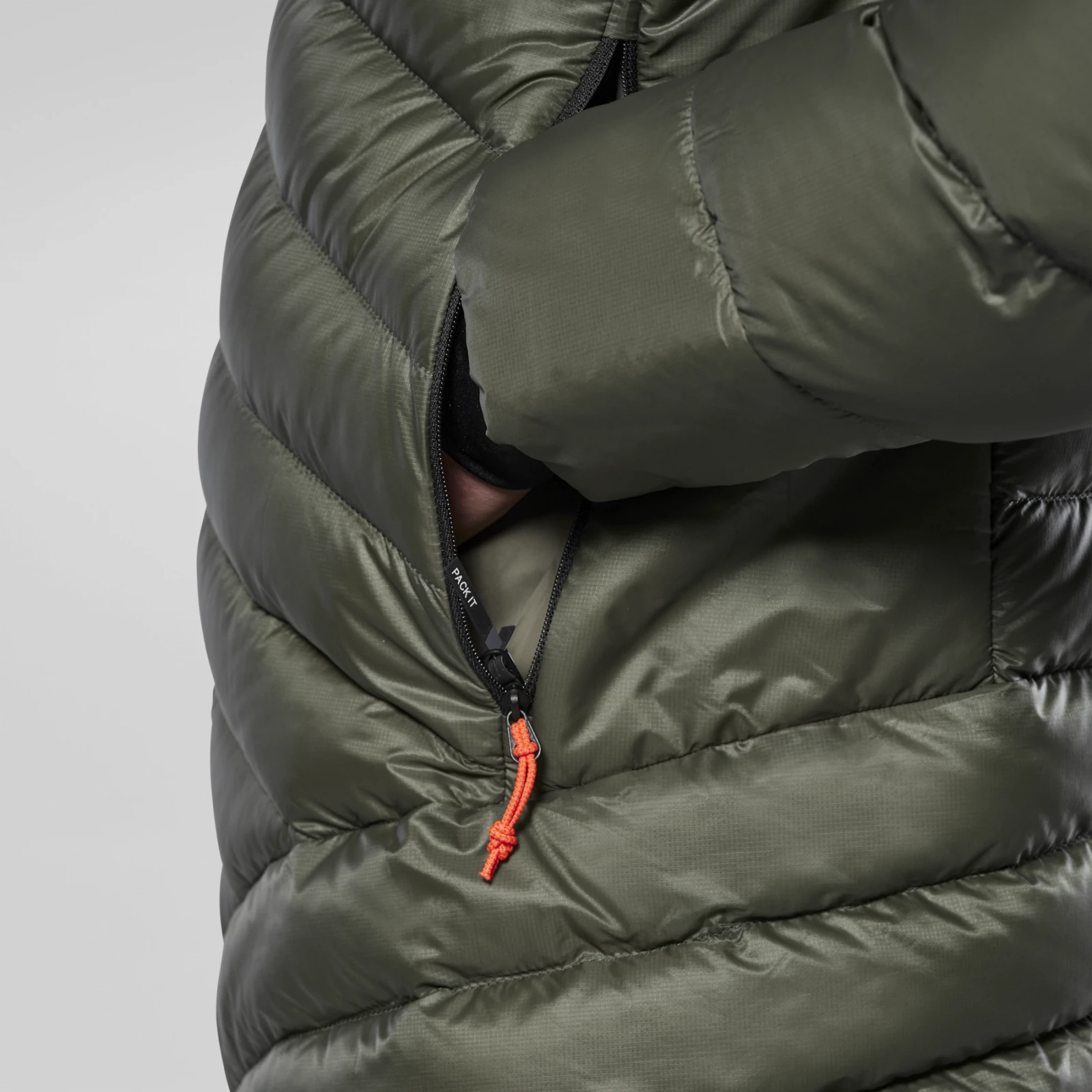 Die Jacke bietet uneingeschränkte Bewegungsfreiheit dank ergonomischer Ärmel , die ein Hochrutschen des Saums beim Klettern verhindern, einfacher Packbarkeit in der eigenen Tasche, einem 2-Wege-Frontreißverschluss und elastischen Innenbündchen. Zwei Seitentaschen mit Reißverschluss, eine Brusttasche mit Reißverschluss und eine Tasche mit integrierter Packlösung erleichtern die Aufbewahrung.
