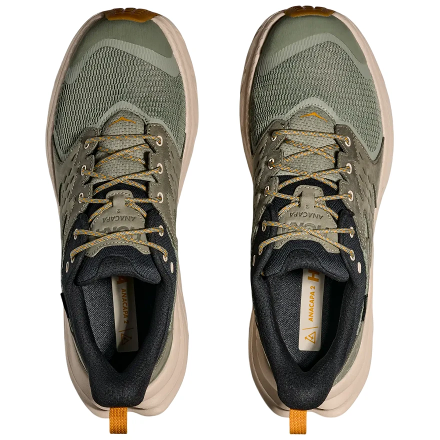 Herren Wanderschuhe Hoka Anacapa 2 Low GTX sind ideale Begleiter für Ihre täglichen Abenteuer in der Natur. Das Obermaterial des Schuhs besteht aus zertifiziertem Nubukleder Leather Working Group, ergänzt mit recyceltem Polyester. Obwohl es sich um Lederschuhe handelt, sind sie sehr leicht.