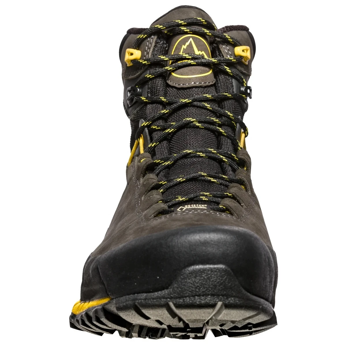 Der Herrenschuh La Sportiva TX5 Gtx ist ein Schuh für Wanderer und Rucksacktouristen. Der Schuh ist wasserdicht und atmungsaktiv dank der Verwendung der Gore-Tex Extended Comfort -Membran und äußerst komfortabel dank des weichen Obermaterials aus Nubukleder. Sie verfügen über eine Rundum-Schutzgummierung entlang des Schuhs und an der Spitze. Das 3D Flex System ermöglicht maximale Traktion im Gelände und macht den Schuh ideal für den Langzeitgebrauch. Die Sohle nutzt Vibram MegaGrip und ein stoßdämpfendes Bremssystem für eine bessere Stoßdämpfung und einen stabilen Fußhalt auf jedem Gelände.