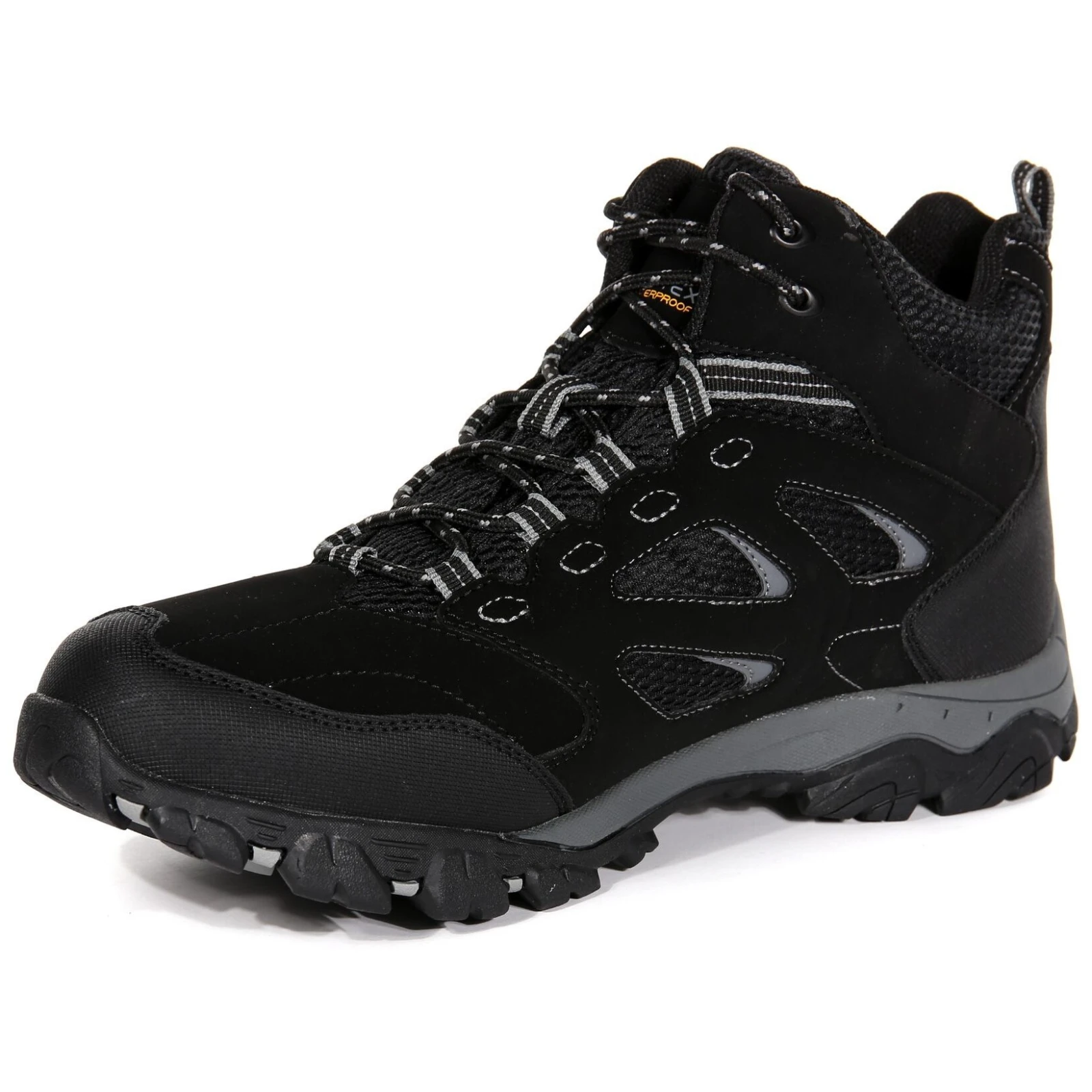 Wanderstiefel für Herren Regatta Holcombe IEP Mid sind leichte, knöchelhohe, wasserdichte Stiefel, mit denen Sie im Gelände gut vorankommen. Dank der ISOTEX -Membran bleiben Ihre Füße auch bei widrigem Wetter stets trocken. Hierzu trägt auch die hervorragende Atmungsaktivität von Schuhen mit Hydropel-Technologie bei. Dank der geformten und bequemen EVA -Zwischensohle haben Sie in Ihren Schuhen das Gefühl, Hausschuhe zu tragen. Die hochwertige Gummisohle sorgt für guten Halt und Stoßdämpfung beim Wandern in den Bergen. Gummierte Verstärkungen machen den Schuh noch langlebiger.