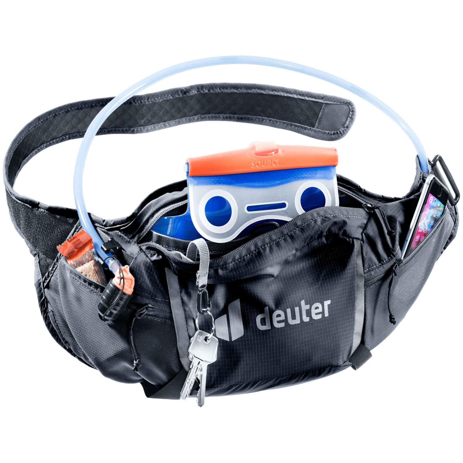 Laufband Deuter Shortrail III in Nierenform. Dieser Gürtel ist dank seines größeren Volumens, der Möglichkeit zur Befestigung von Trekkingstöcken und der Vorbereitung für eine Trinkblase ideal für längere Wanderungen . Auch Wertsachen und Energieriegel sind dank der smarten Fächeraufteilunggut erreichbar. Der passgenaue Hüftgurt reduziert überschüssiges Gewicht und sorgt für eine individuelle Passform. Dieses bluesign®-Produkt verwendet Stoff aus 100 % recyceltem Material. Es erfüllt den Grüner Knopf-Standard, ist klimaneutral und enthält kein PFC.