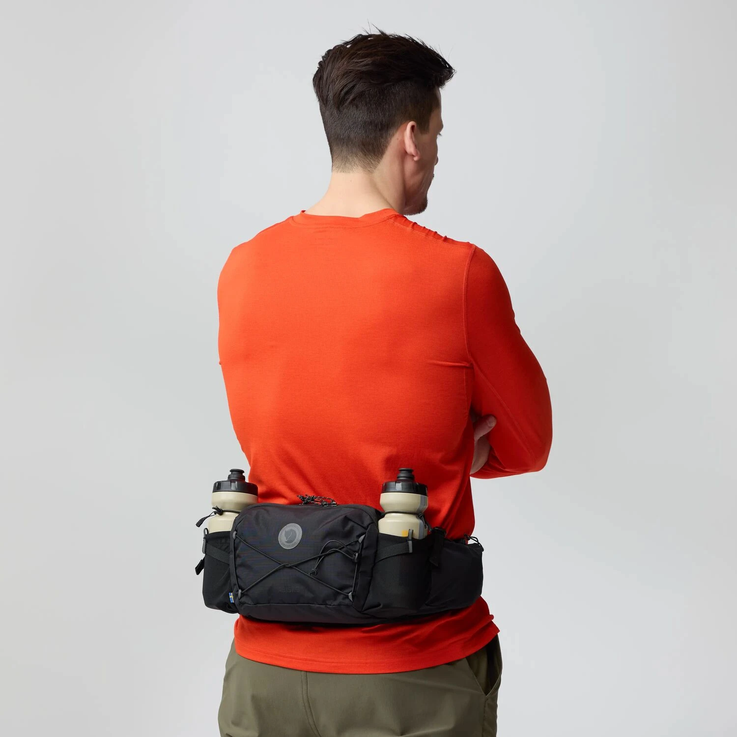 Die Gürteltasche hat ein großes Fach mit Innentaschen und einem Organizer, ein kleineres Fach, zwei dehnbare Flaschentaschen und zwei leicht zugängliche Seitentaschen. Eine elastische Kordel auf der Vorderseite dient zur Befestigung zusätzlicher Ausrüstung.