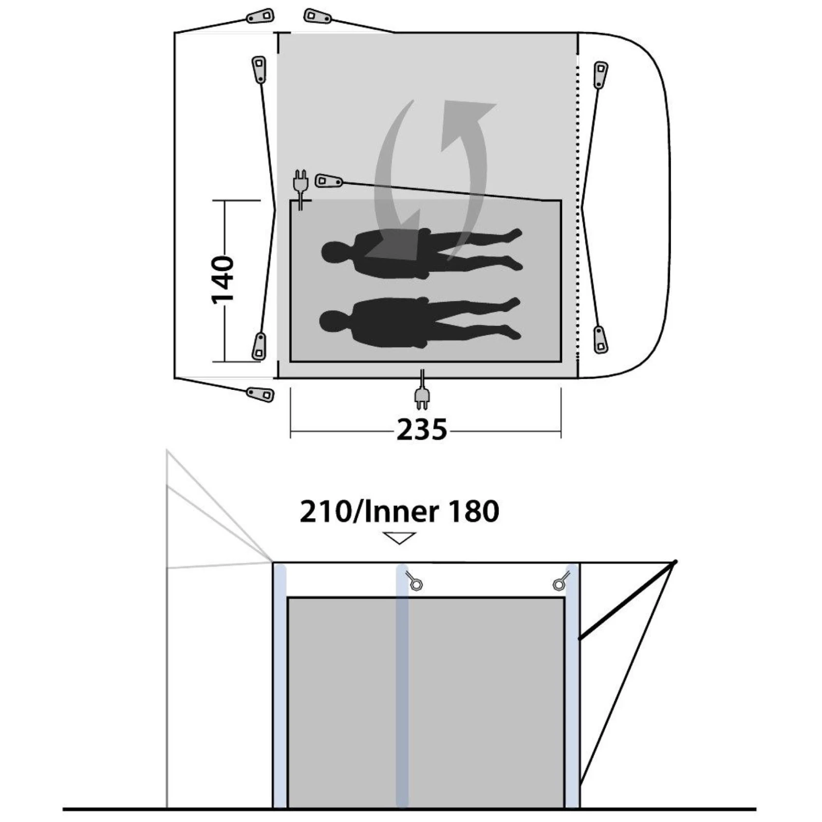 Das Schlafzimmer Outwell Inner Newburg 260 kann schnell und einfach an der Markise befestigt werden, um einen privaten Raum für 2 Übernachtungsgäste zu schaffen.