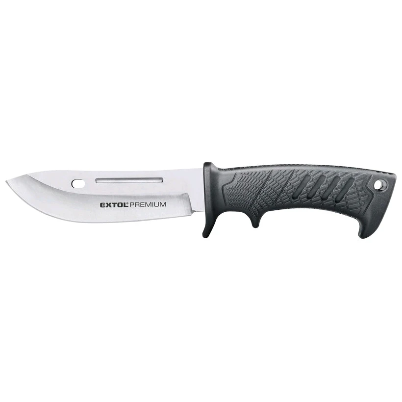 Jagdmesser Extol Premium 270/145 mm mit einer Klinge aus rostfreiem Stahl mit einer Länge von 145 mm sollte in keiner Männerausrüstung fehlen. Das Messer verfügt über einen geformten Griff mit einer Länge von 125 mm, der gut in der Hand liegt. Der Griff verfügt über ein Loch für eine Trageschlaufe, sodass Sie das Messer an Ihrem Rucksack oder an der Hüfte befestigen können. Zum Lieferumfang des Premium-Messers Extol gehört ein Gürtelholster aus Nylon mit Nieten, die ein Durchschneiden der Nähte des Holsters verhindern.