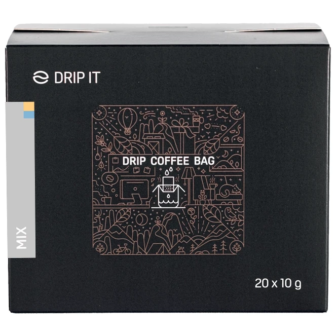 Qualitätskaffee für unterwegs, das ist Mix – Kolumbien, Honduras 20x10 g von der Marke Drip it. 100 % erlesener Arabica, mittel geröstet, ist in den Filter gemahlen, sodass Sie für die Zubereitung nur heißes Wasser benötigen.