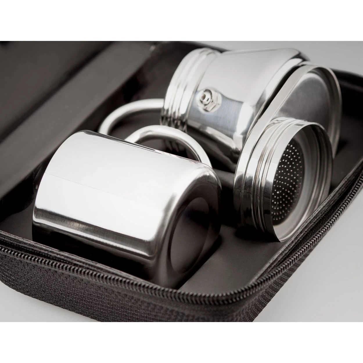 Mit dem kleinen, leichten und kompakten Kaffeezubereitungsset MiniEspresso Set 1 Cup können Sie Ihre Tasse Kaffee in 90 Sekunden zubereiten. Einfach mit Wasser füllen, Kaffee hinzufügen und auf den Herd stellen. Durch den entstehenden Druck gelangt der Kaffee direkt in die Tasse. Zu diesem tollen Set gehört auch ein praktischer Koffer für den bequemen Transport.