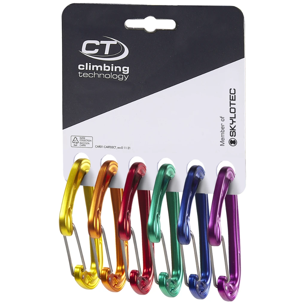 Set aus sechs ultraleichten Fly-Weight-Evo-Karabinern der italienischen Marke Climbing Technology in verschiedenen Farben: Gold, Orange, Rot, Grün, Blau, Lila. Sechs kompakte Karabiner mit Leichtmetalldrahtschloss.