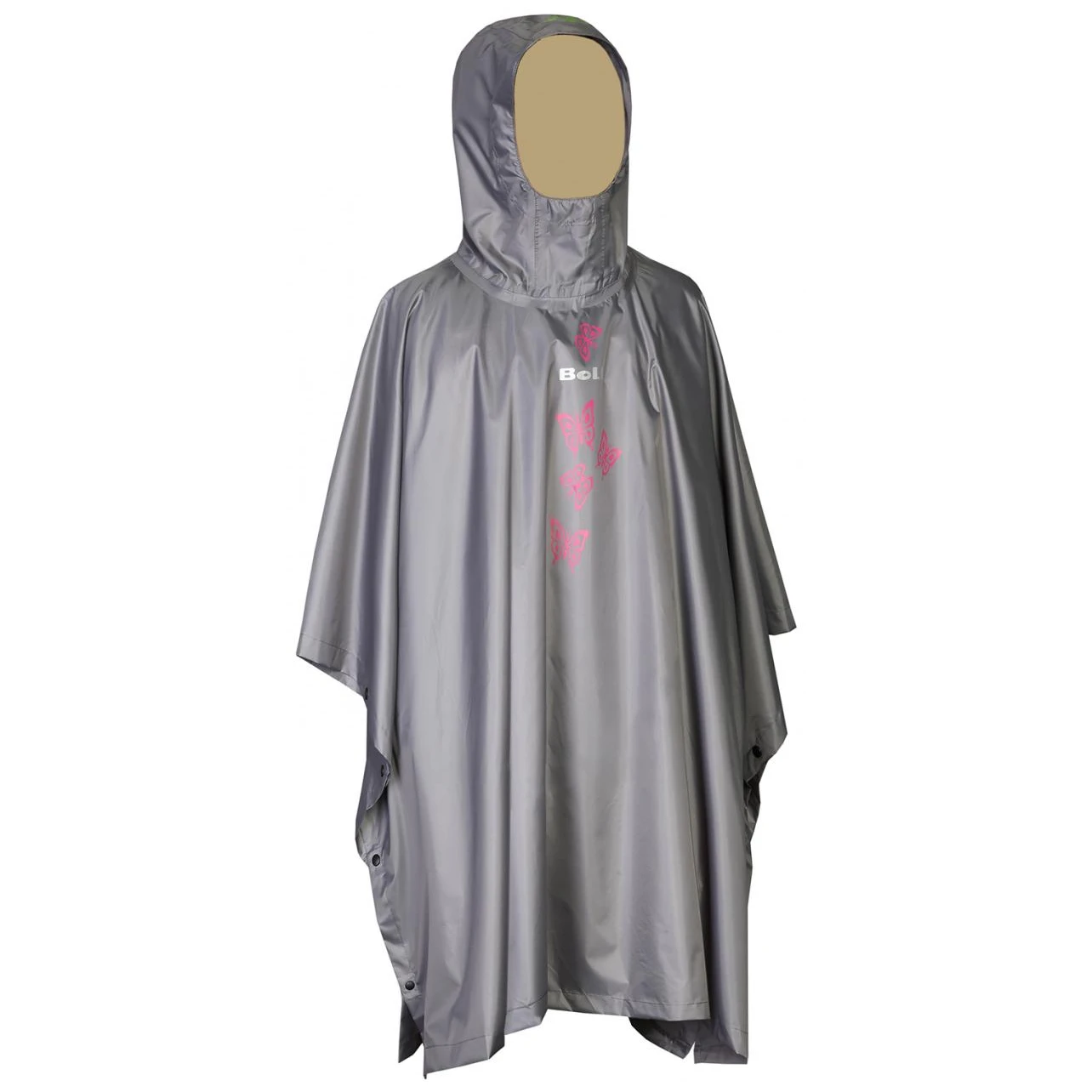 Der Poncho lässt sich seitlich mit Kunststoff-Druckknöpfen befestigen. Der Poncho ist mit reflektierenden Aufdrucken auf der Vorder- und Rückseite ausgestattet, um die Sicherheit bei schlechten Sichtverhältnissen zu erhöhen.