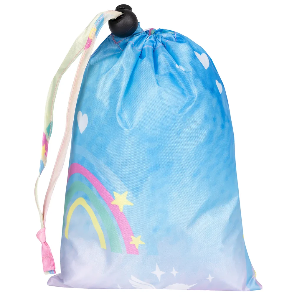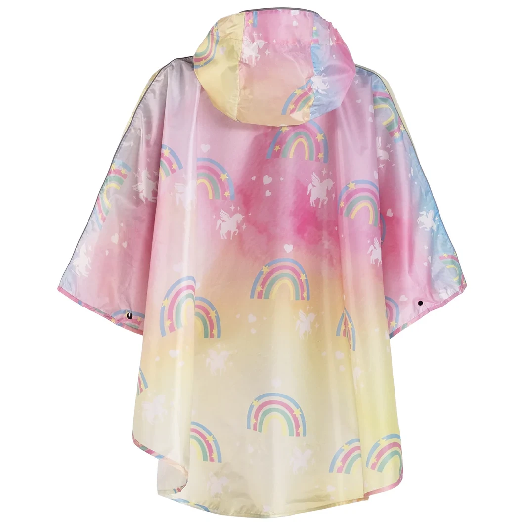 Unicorn Kinderregenmantel mit Schirmkapuze der tschechischen Marke Baagl aus hochwertigem, wasserdichtem Material. Der Regenmantel ist im Poncho-Stil gehalten und kann bequem über einem Rucksack oder einer Schultasche getragen werden. Reflektierende Elemente tragen zur Sicherheit der Kinder bei. Der Regenmantel ist in einem kleinen, praktischen Beutel verpackt.