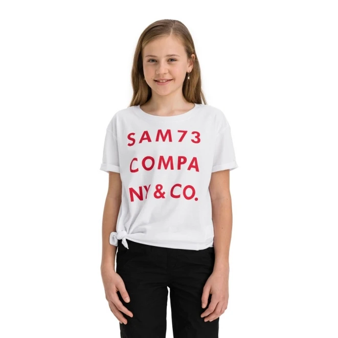 Melanie ist ein Kinder Kurzarm T-Shirt der Firma Sam73, mit einem raffinierten Schlitz, dessen Kanten man an heißen Sommertagen zu einer Schleife machen und so das T-Shirt verkürzen kann.