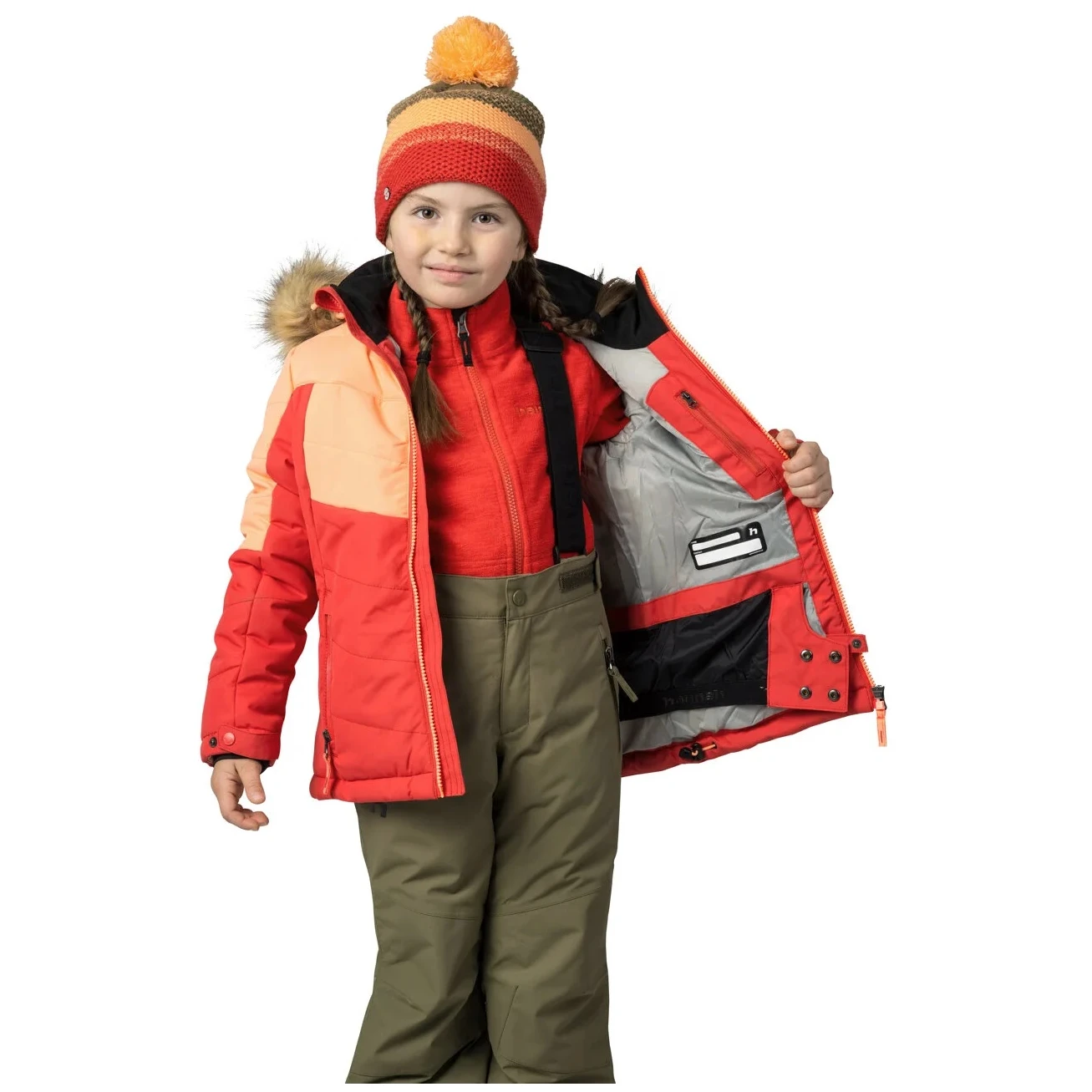 Die Jacke ist leicht und weich, sitzt gut und der Saum lässt sich bei Bedarf nach unten ziehen. Deine Hände bleiben dank des elastischen Bündchens warm und die Ärmelenden lassen sich per Klettverschluss verstellen. Ein Schneekragen an der Taille verhindert, dass Schnee unter die Jacke gelangt. Sie finden eine praktische Skipasstasche am Ärmel, zwei Haupttaschen mit Reißverschluss an den Seiten und eine weitere Reißverschlusstasche für kleine Gegenstände im Inneren. Die Jacke hat ein modernes und jugendliches Design, das das stylische Fell perfekt zur Geltung bringt und durch reflektierende Elemente sind Kinder auch im Dunkeln gut sichtbar.