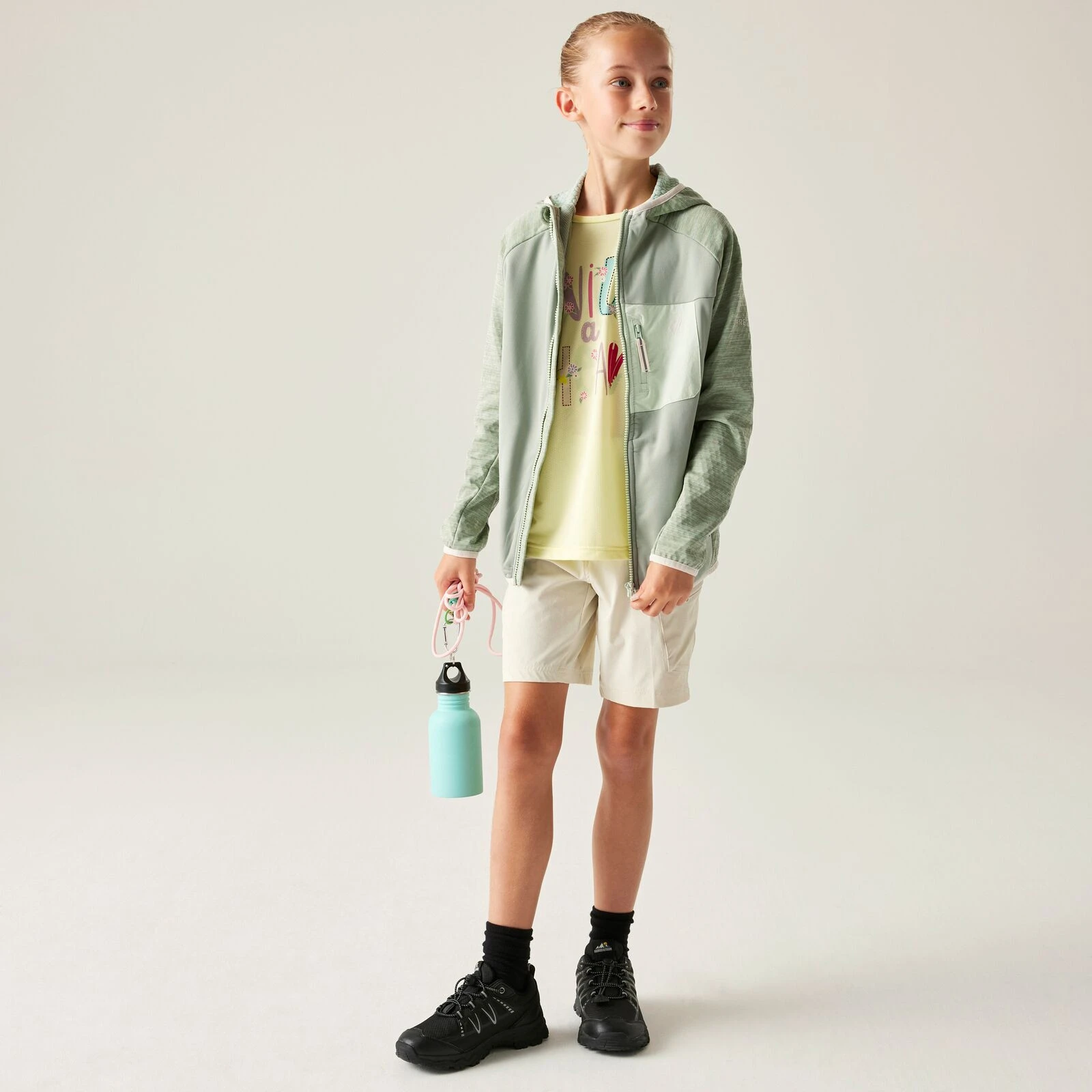 Das Dare2b Kids' Expedition Stretch Midlayer GlacierGreen Wander-Sweatshirt ist für große und kleine Abenteuer gemacht. Dank der Rückseite aus warmem Fleece hält es Kinder zuverlässig warm und garantiert ihnen maximalen Komfort. Das hochelastische Material passt sich perfekt jeder Bewegung an und die praktische, feste Kapuze schützt Kopf und Hals vor Kälte.