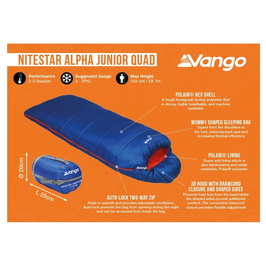 Vango Der Ninestar Alpha Junior Quad ist ein hochwertiger Drei-Jahreszeiten- Kinderschlafsack. Ideal für Familienurlaube oder Camps. Die deckenähnliche Form vermittelt ein heimeliges Gefühl mit perfekter Isolierung und neuer Alpha Insult-Füllung, die dem Schlafsack im ausgepackten Zustand mehr Volumen verleiht, ihn im verpackten Zustand durch eine stärkere Kompression aber auch kleiner macht.