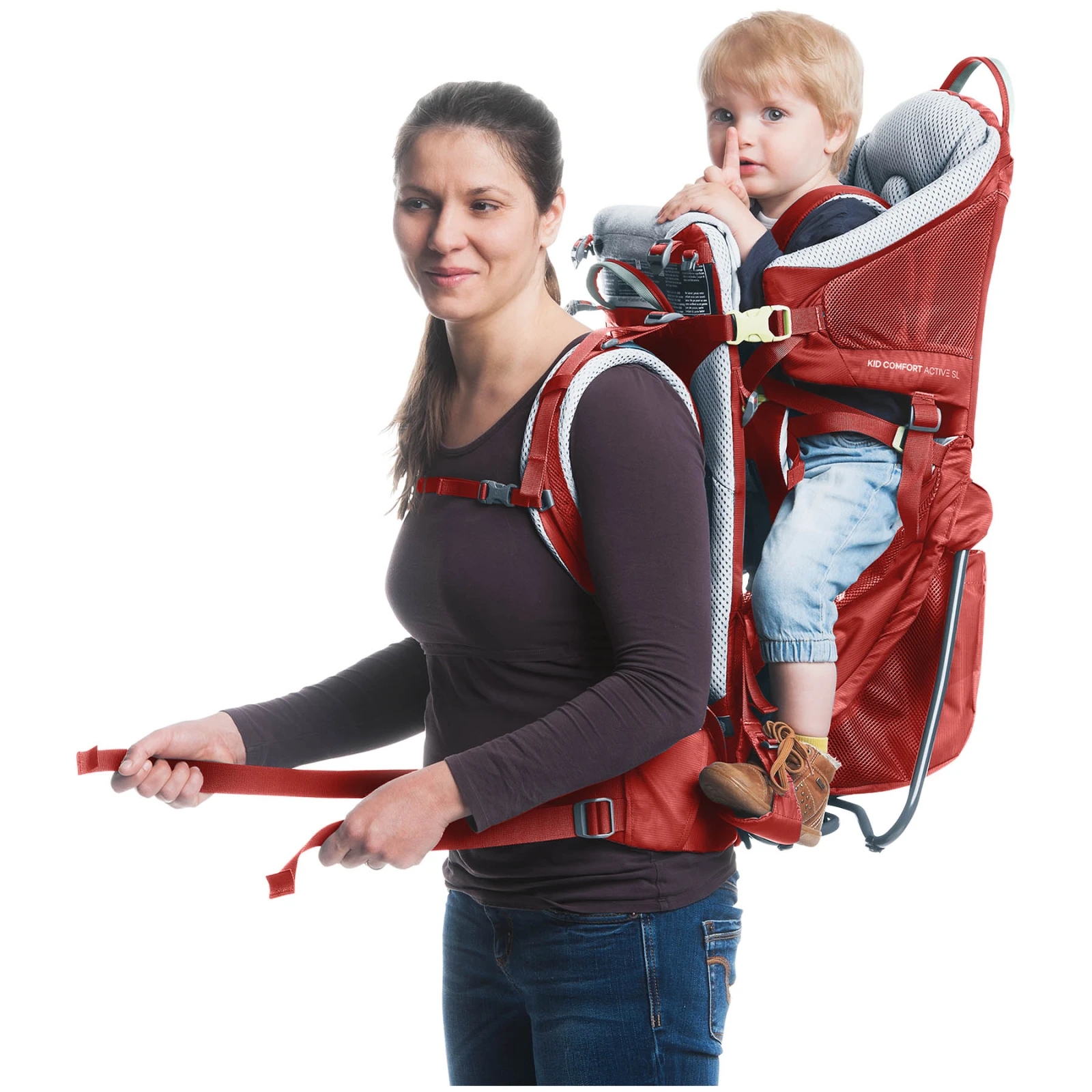 Der Kid Comfort Active SL Kindersitz von Deuter in der Leichtbauvariante ist speziell an die weibliche Anatomieangepasst. Das Rückenstützsystem bietet eine hohe Atmungsaktivität und ist dank des neuen kompakten Lite Air-Rückenkontakts mit maximaler Luftzirkulation außergewöhnlich leicht. Für eine optimale Passform sorgt die verstellbare Rückenlänge mit leicht zu bedienenden Schultergurten und einem anatomisch geformten Hüftgurt. Schmalere Schultergurte, perforierte Seitenteile und konisch geformte Lendenflossen sorgen für maximalen Komfort. Durch den höhenverstellbaren Brustgurt können Sie den Schwerpunkt der Trage anpassen.